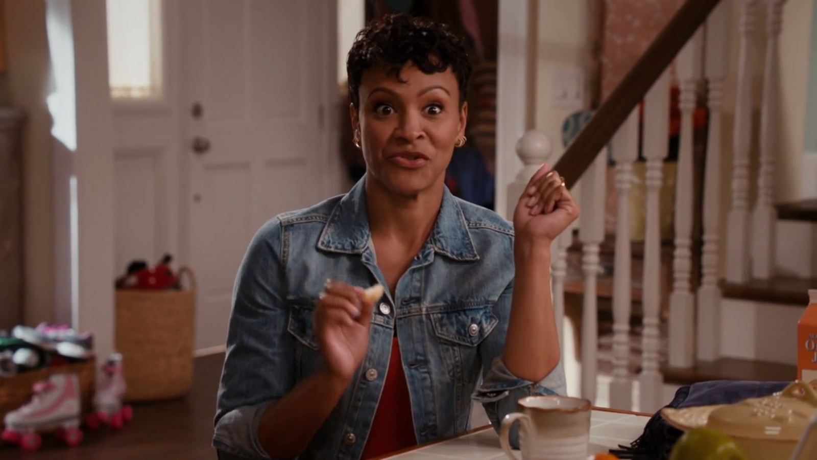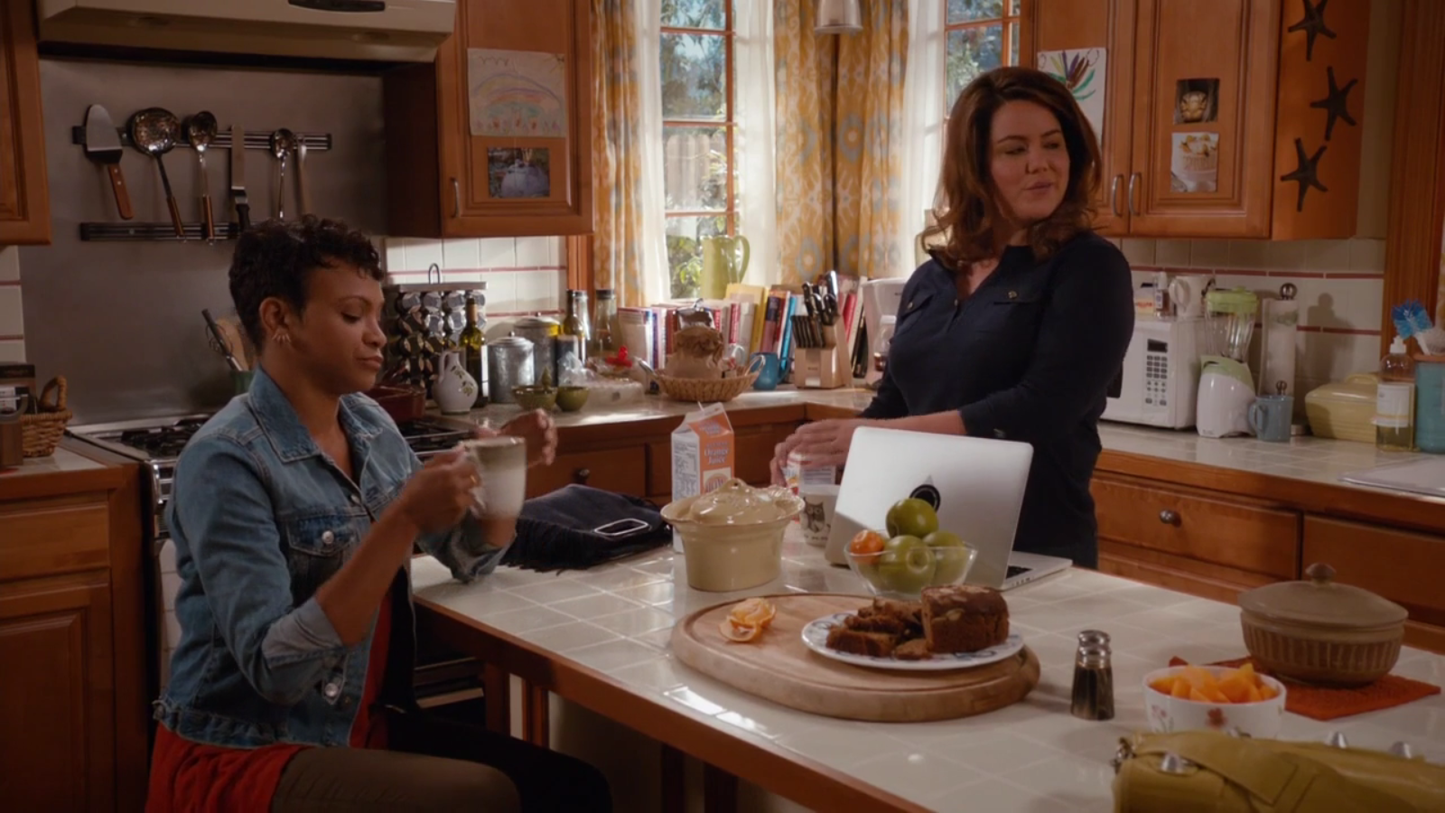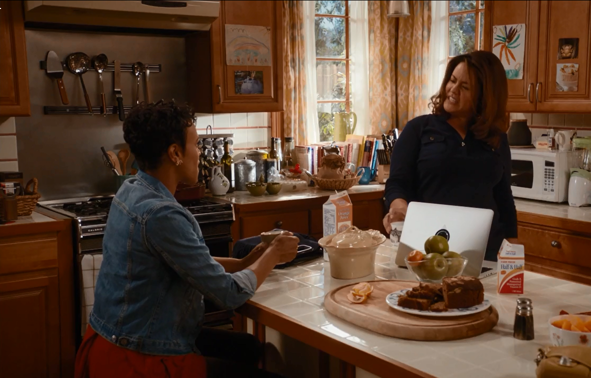 In Episode 4, Katie decided (or was forced) to stop shopping in Westport, because they sell nothing in her size. She now orders all of her clothing from Kansas, where she is a size Medium. While reveling in her triumph with best friend Angela, we can see an assortment of mismatched dishes in the Otto kitchen. On the center of the island is a Casafina Madeira Harvest Oval Covered Casserole dish. This charming pattern features embossed fruit and antiqued edges. The pattern comes in white, honey, dijon, sage, robin’s egg, vanilla, smoked salmon, and moss.