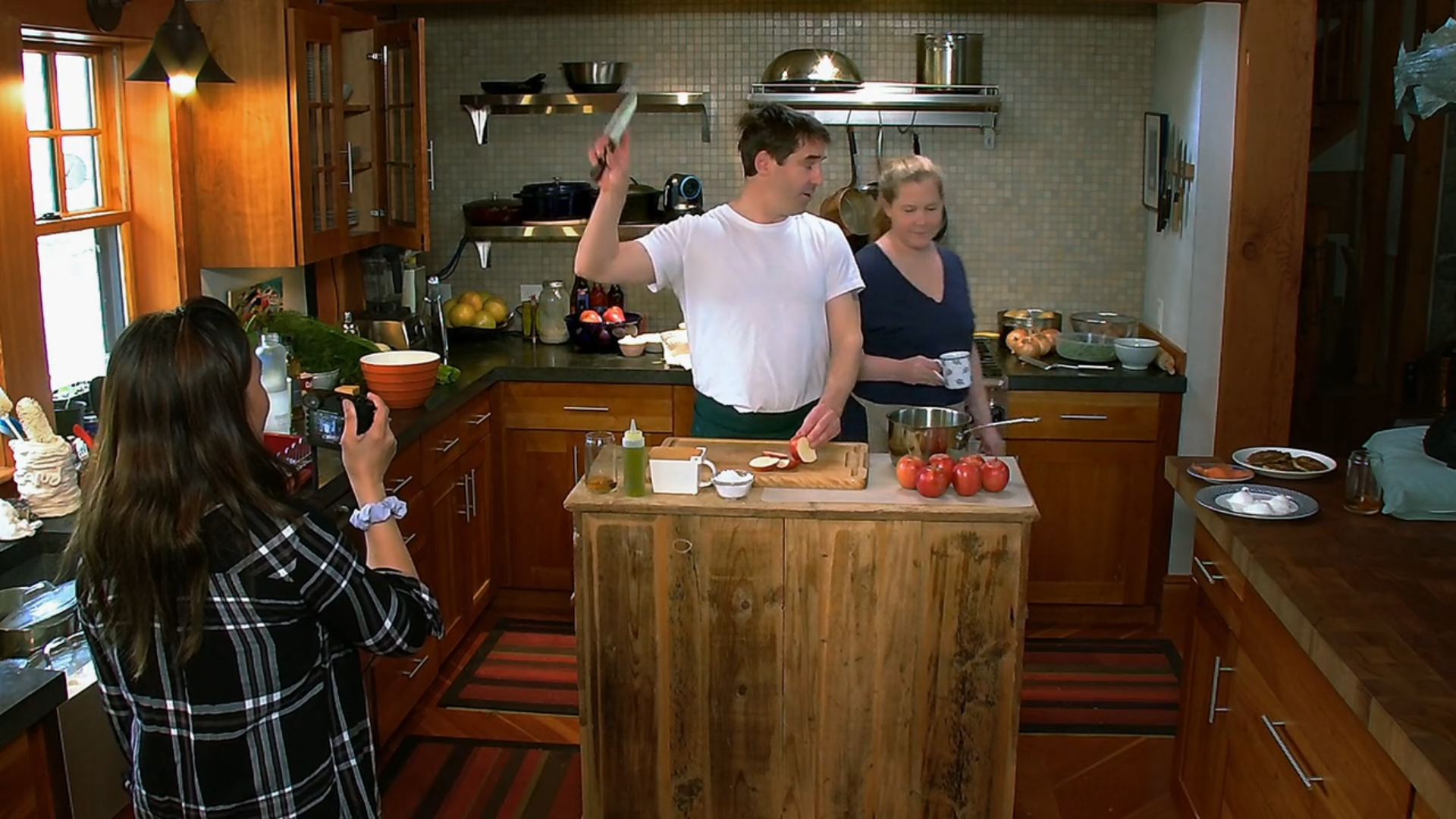 In Episode 1, Amy and her husband, chef Chef Chris Fischer are making breakfast. Breakfast includes latkes, poached eggs, a shaved fennel and celery salad, smoked salmon, and homemade applesauce – both for the laktes and for their son Gene. If you don’t know the story about why they had to rename their son, you can read about it here. Classic Amy.
