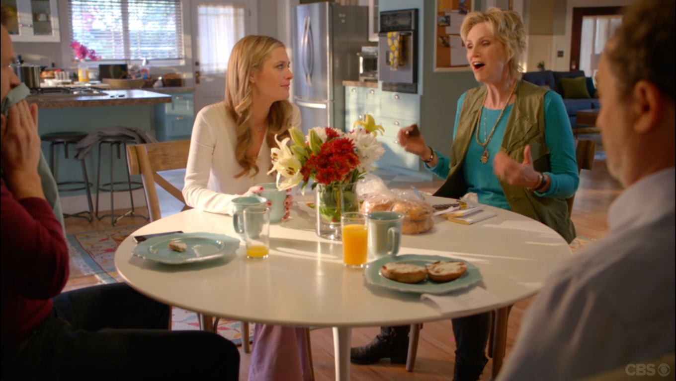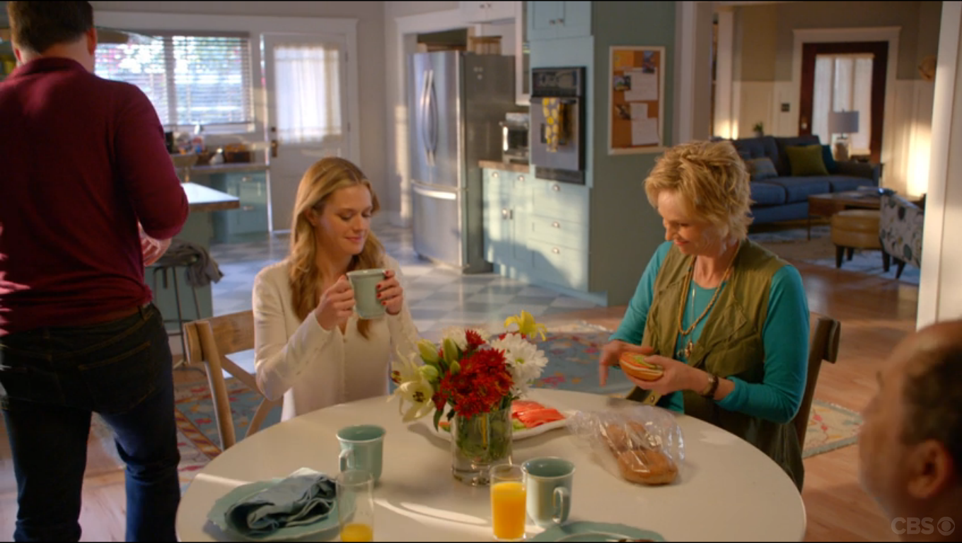Allison’s bright and airy kitchen is the perfect setting for the popular everyday dishes – Wellsbridge Aqua by Threshold (Target). Its also the perfect place for the family to catch up on the day’s events. Amy was just scammed into purchasing disgusting chocolate from a 32 year old “high school student”; Marv was shamed by a woman whom he asked out in the bagel shop (after she said he reminded her of her late father); and Brad is off to sell a creepy mansion full of taxidermied animals.