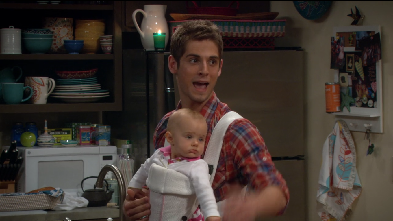 Trying to get over her crush on Ben the Baby Daddy, (played by the charming and disarmingly adorable Jean-Luc Bilodeau) Reilly (Fat Pants) decides to go out with her fellow law school student, Jack. However, it is impossible to move on from her crush when the guy you are trying to get over decides to show up in your apartment. This is the first look we get at Reilly’s apartment where she has a bright, colorful mix of dishes stacked in her kitchen. Among the bold colors is the fun Home (Target) Zinnia pattern. The Zinnia pattern features large-print, stylized flowers and leaves in vivid colors.