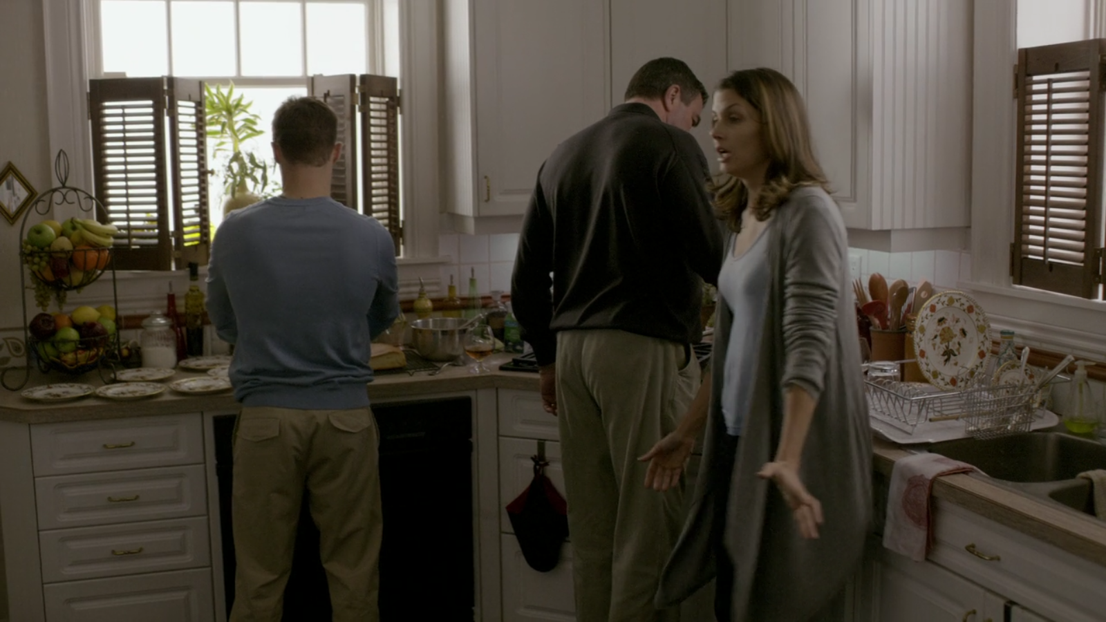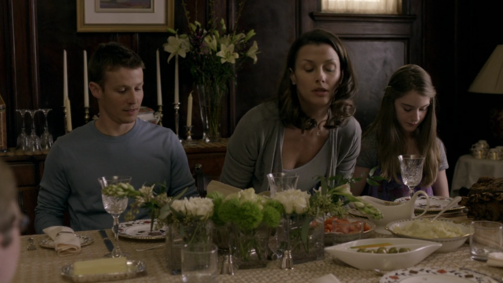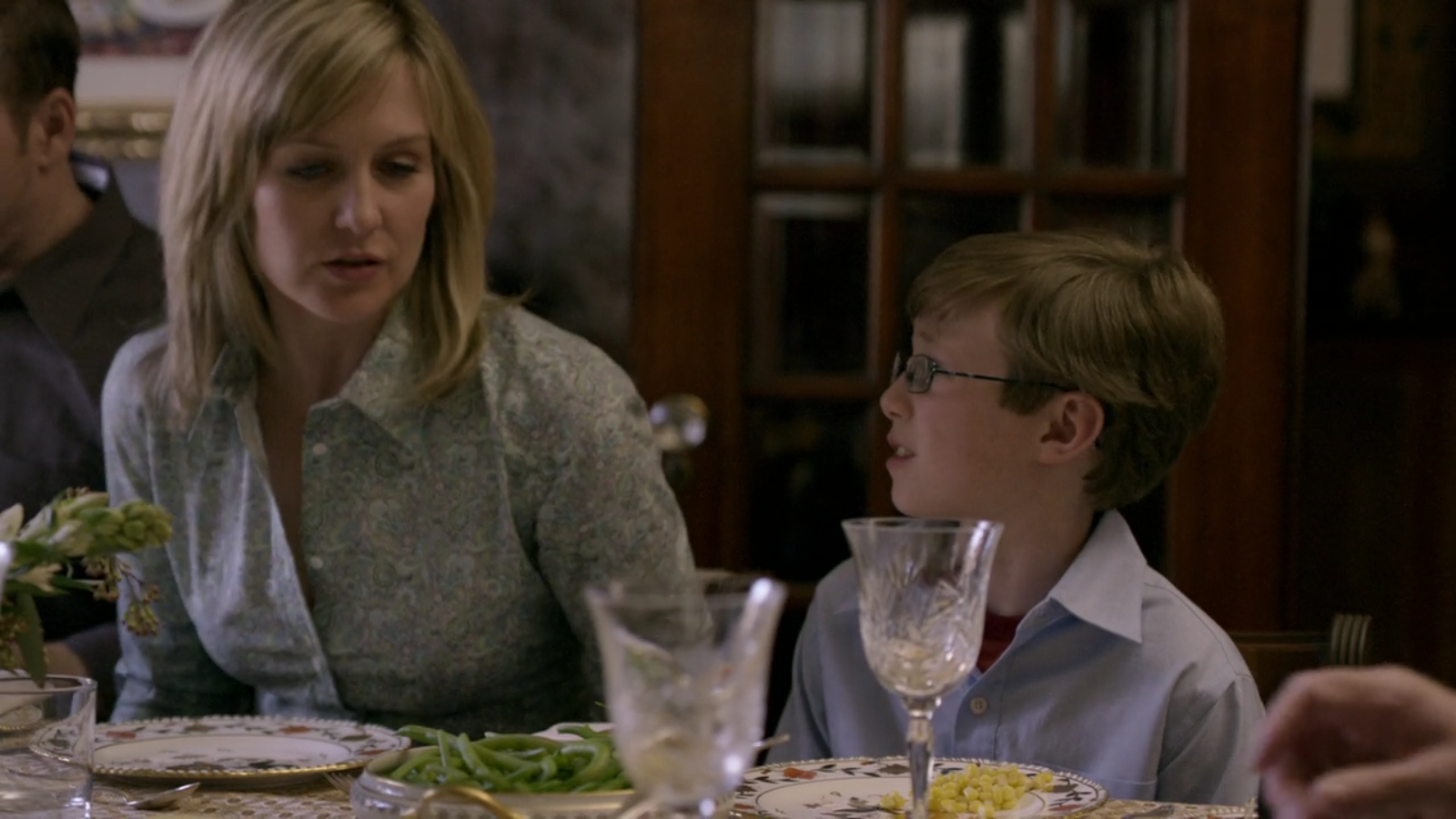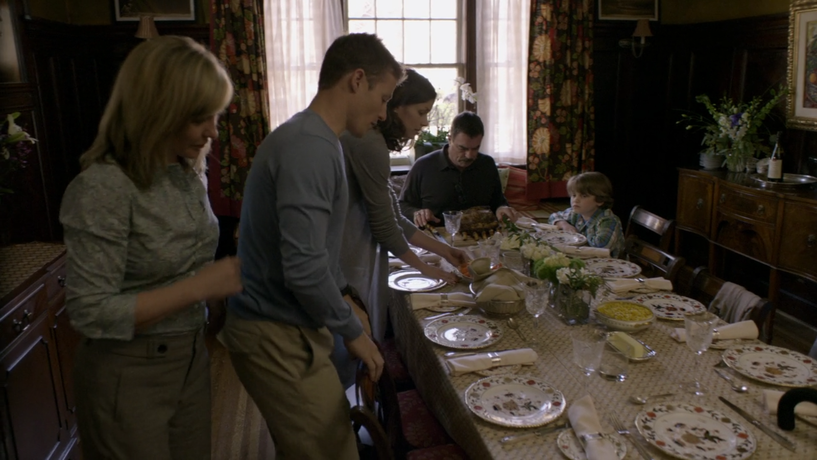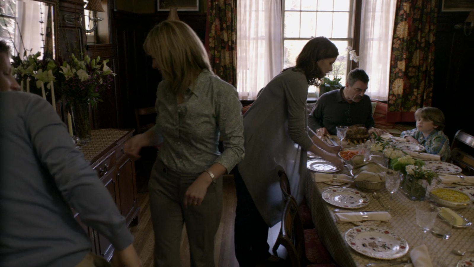 Similarly, in the pilot, the family dinner is served on Royal Crown Derby Gadroon Rose. This pattern is only seen in the pilot, and afterwards, the family dines on Mottahedeh Sacred Bird & Butterfly – read more here.