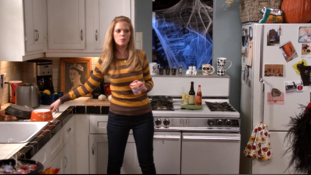 It is Halloween and June and Chloe are discussing their ghoulish plans for the day. While they ruminate in the kitchen we see a fitting piece for the spooky, harvest season! The Pyrex Autumn Harvest bowl is situated next to the kitchen sink. In the first scene, we see the dish drying on the towel upside down and in the second scene we see the bowl propped upright, ready for use. The Pyrex Autumn Harvest pattern features a festive burnt orange background color with various wheat stalks designed on the front of the dish. The pattern is also known as Wheat Stalks, Autumn, Wheat Harvest, Summer Grain.
