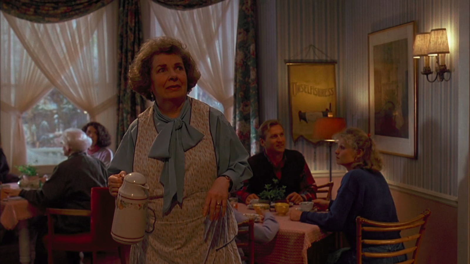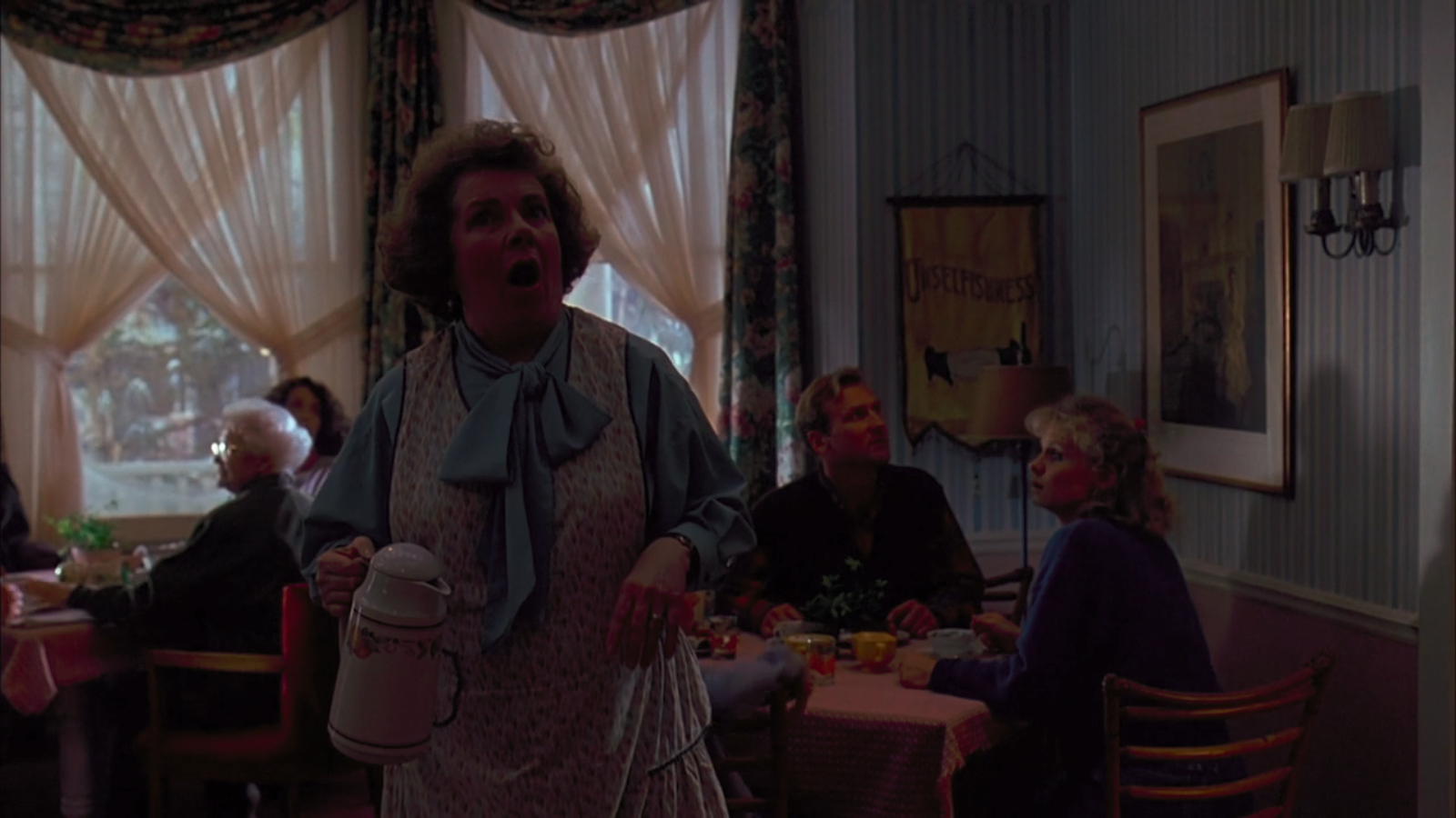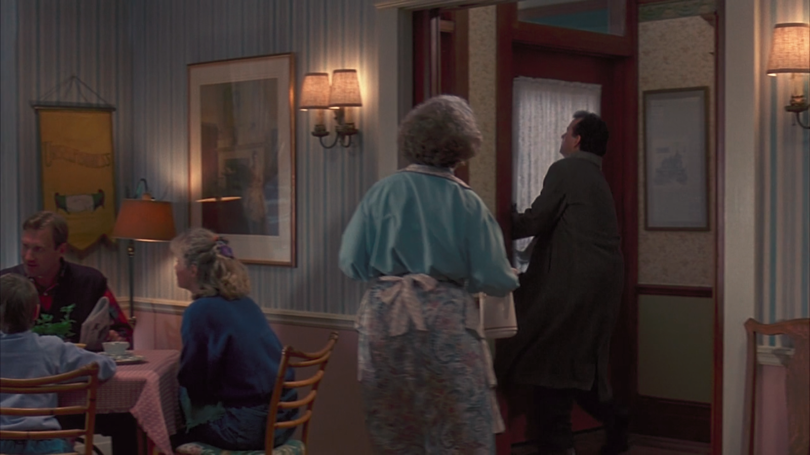 However, there is one well known, well loved, dish pattern that is used at the Bed and Breakfast – Corelle Abundance. We first see it in a blur as Bill Murray’s character, Phil Conners, first realizes that something is not right. He rushes out of the bed and breakfast, trying to figure out what is going on. Why is the day repeating itself? Later, we get a better shot of the Corelle Abundance carafe, again in the hands of Mrs. Lancaster. In this later scene, Phil has just taken a toaster upstairs, to drop into the tub. Phil was testing whether death would end the repeating February 2nd. It didn’t.
