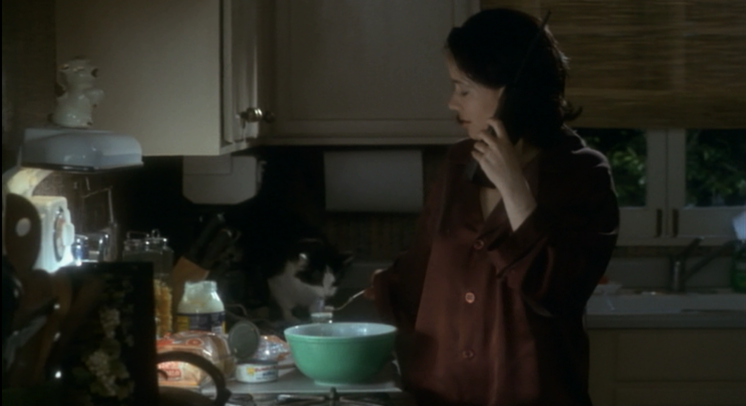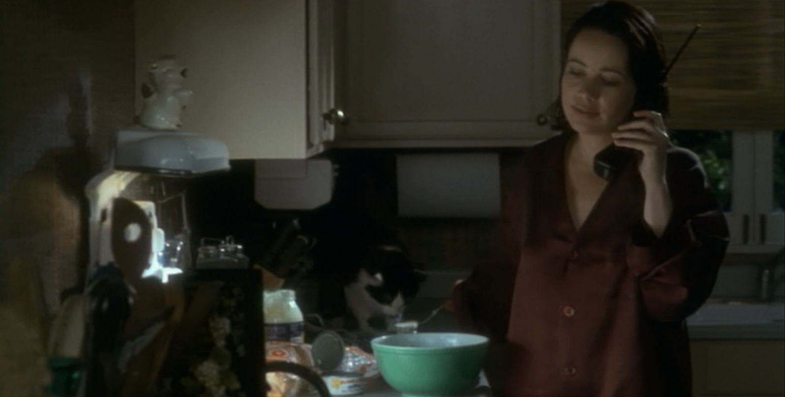 During the phone conversation, Abby gives Brian step by step instructions on how to make the best tuna fish sandwich. She mixes her magic recipe in a fabulous Pyrex Primary Colors Mixing Bowl. (Letting your cat lick the spoon is optional).