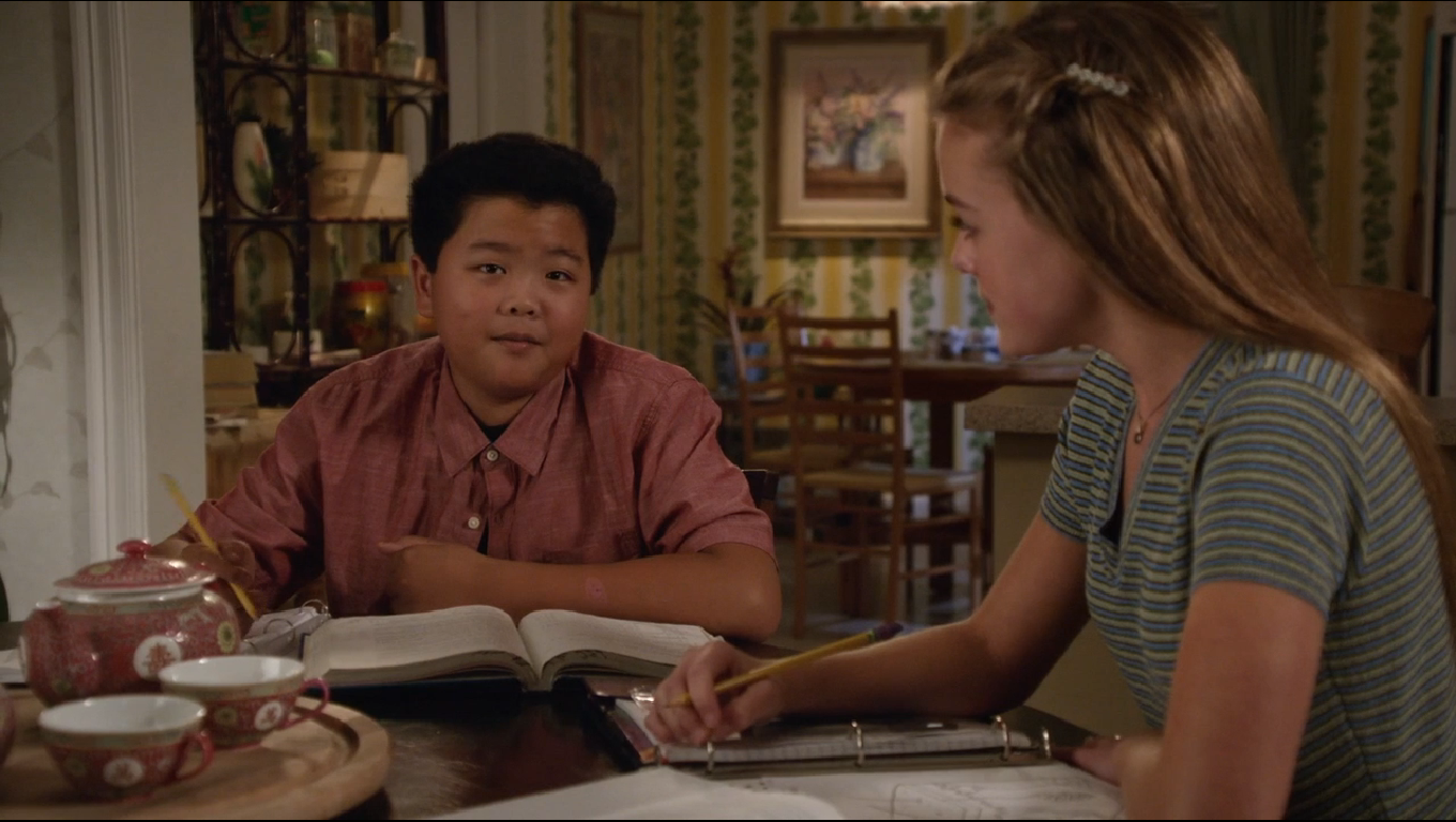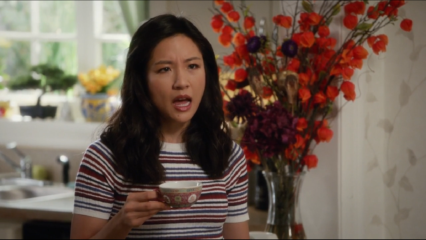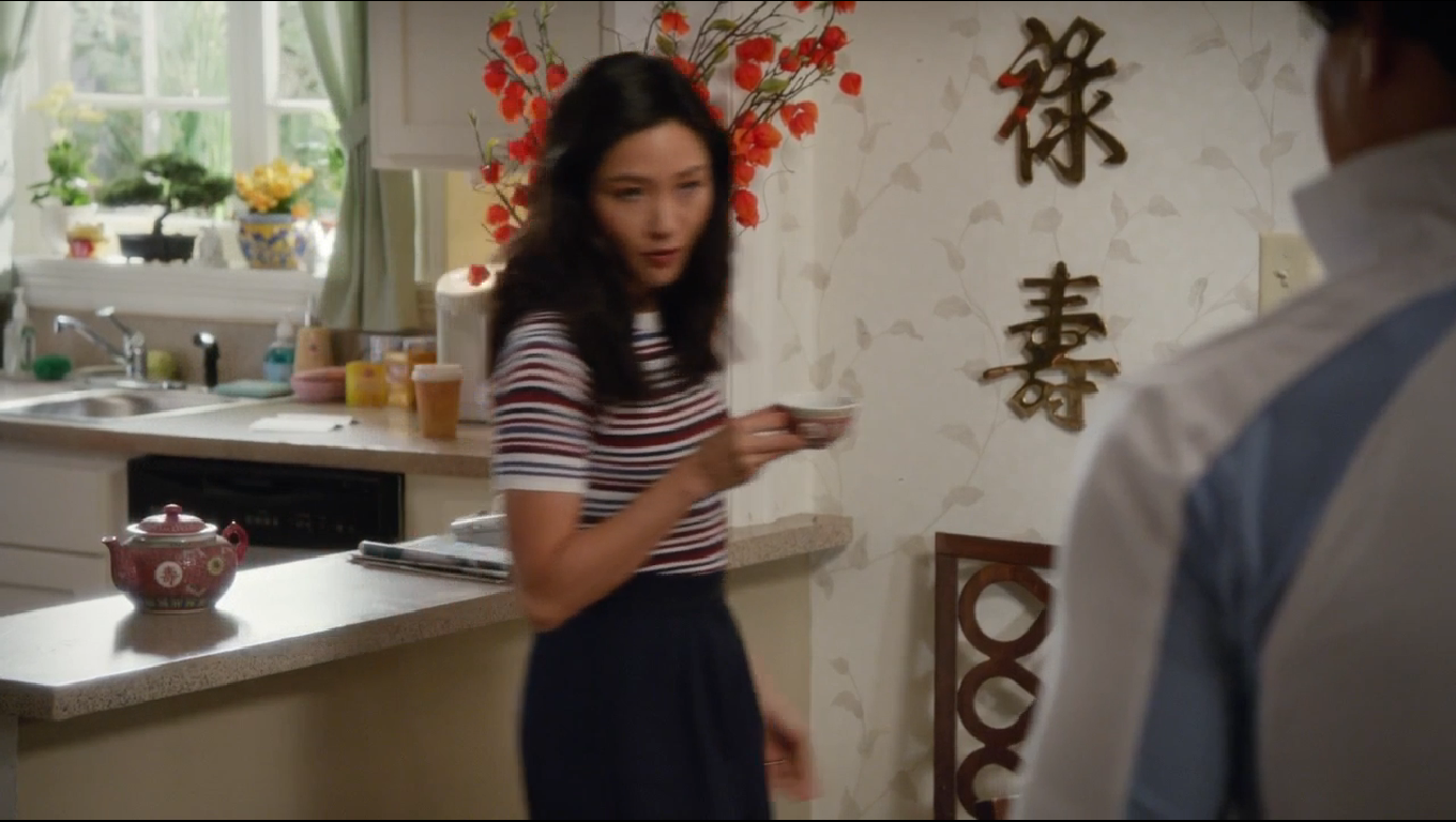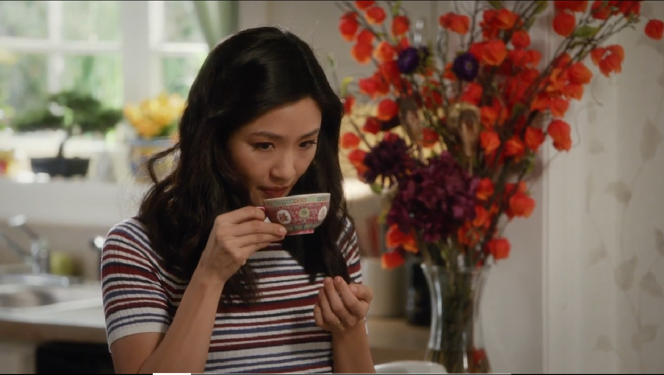 As Louis fully embraces the American tradition of Halloween, Jessica has her reservations about the holiday. She contents that Halloween isn’t special like Christmas or when a new Denzel movie comes out. She goes on to aver that it is just not for her because she likes who she is, she likes how she looks, and she doesn’t see the point of dressing ridiculously for a lolly pop. This rather philosophical take on Halloween is delivered while calmly sipping tea from a traditional red enamelware tea cup. An enamelware teapot is sitting on the counter behind her.