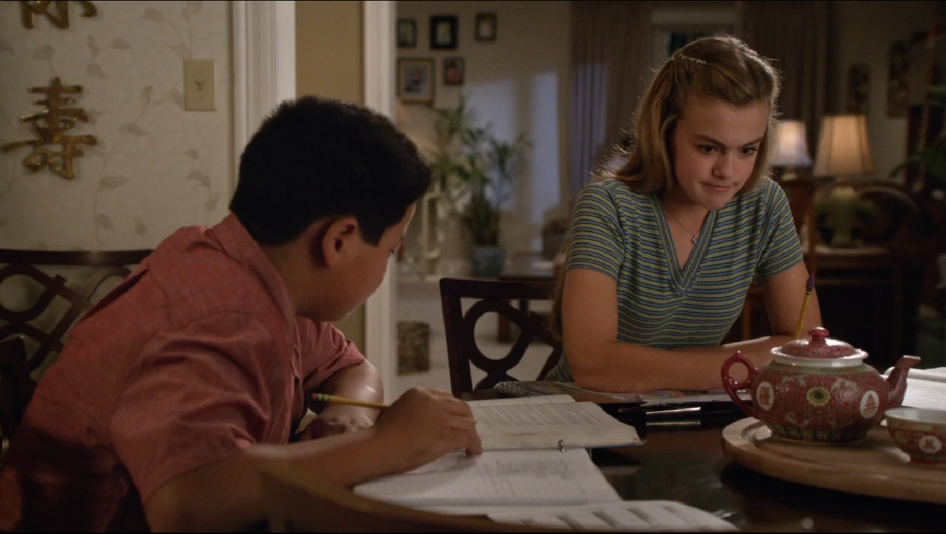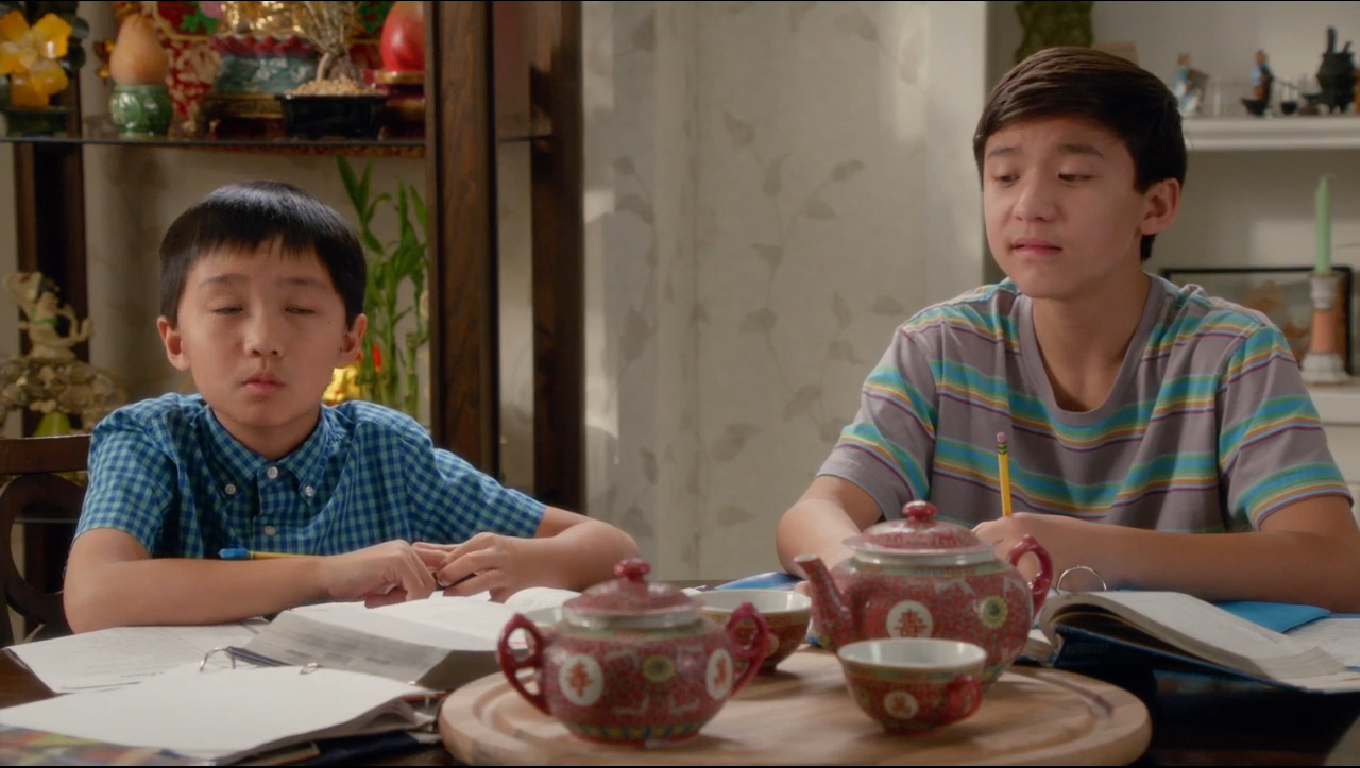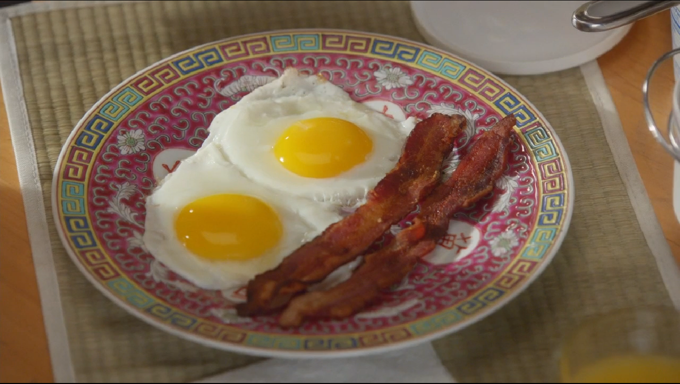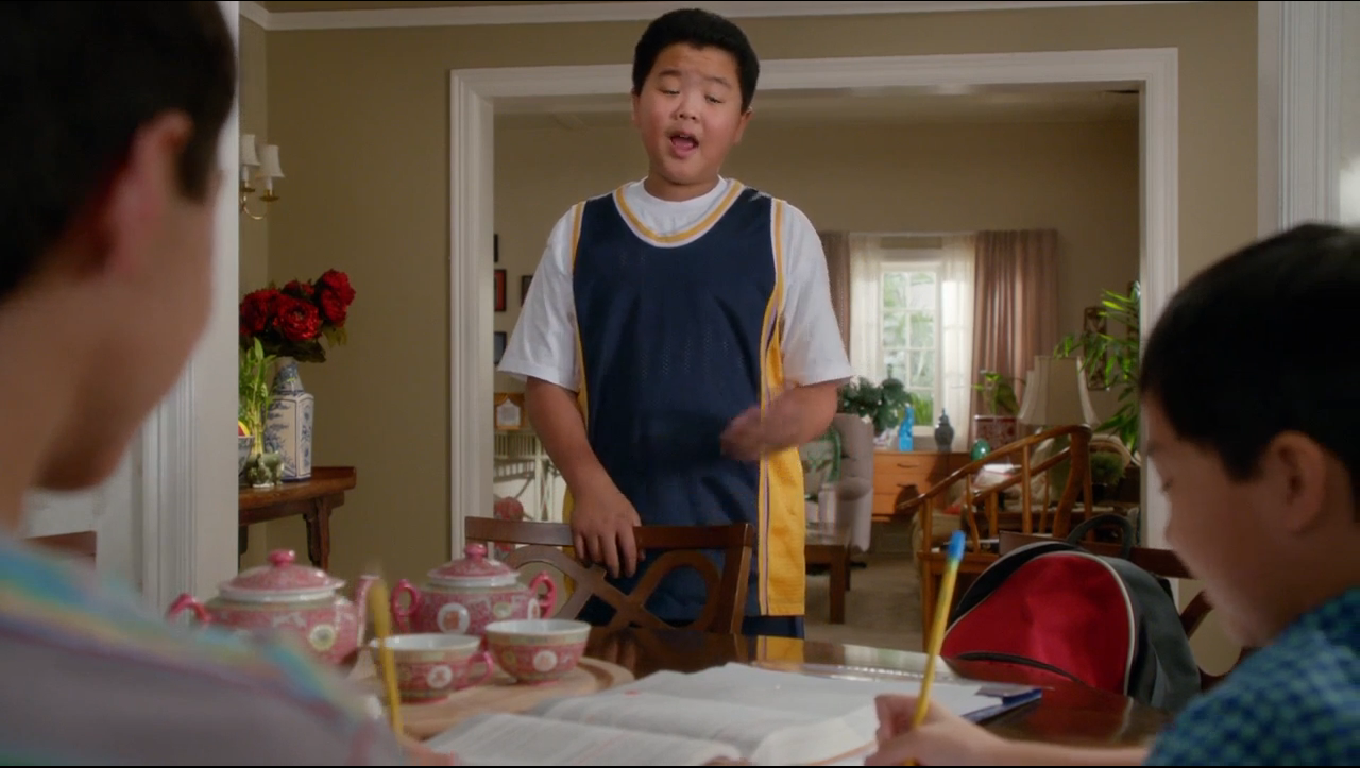 As Louis fully embraces the American tradition of Halloween, Jessica has her reservations about the holiday. She contents that Halloween isn’t special like Christmas or when a new Denzel movie comes out. She goes on to aver that it is just not for her because she likes who she is, she likes how she looks, and she doesn’t see the point of dressing ridiculously for a lolly pop. This rather philosophical take on Halloween is delivered while calmly sipping tea from a traditional red enamelware tea cup. An enamelware teapot is sitting on the counter behind her.