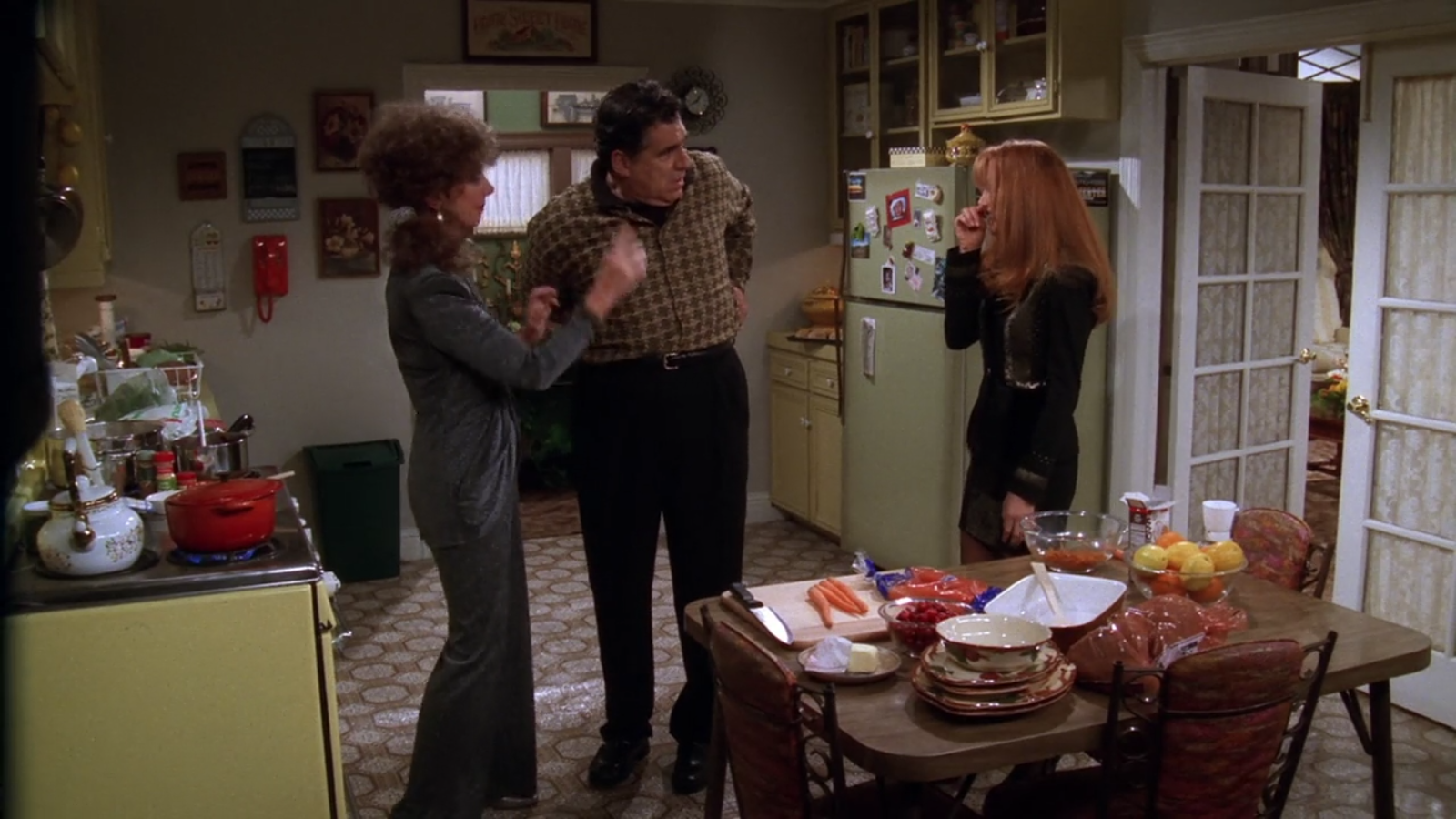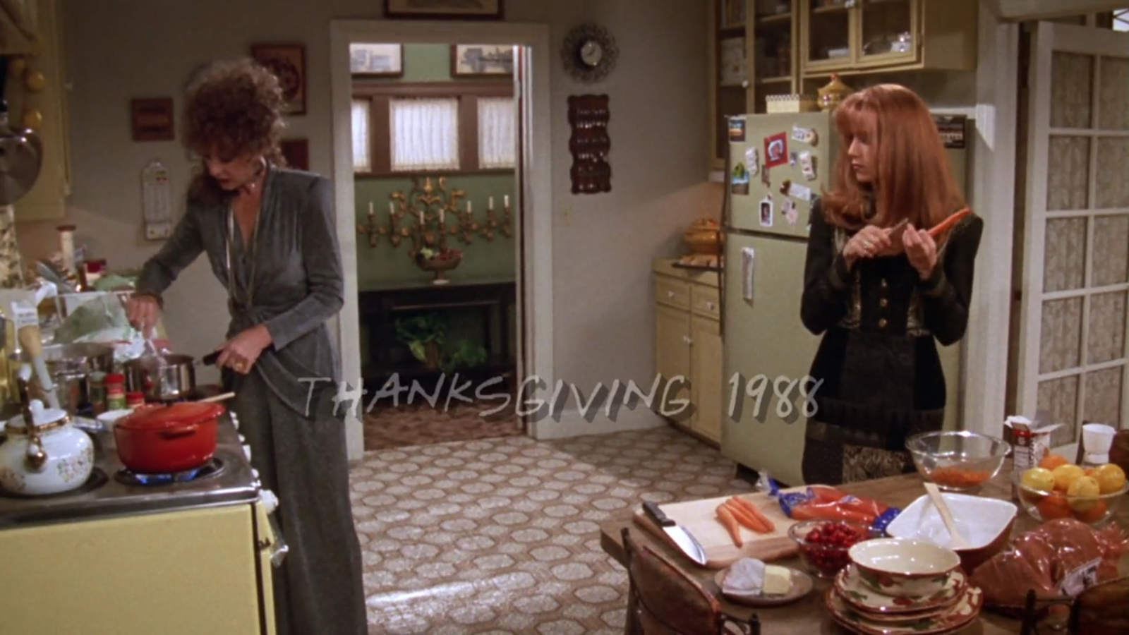 Throughout the 80’s and 90’s flashbacks, one characteristic remains constant: dinnerware! The Geller family uses the vintage Franciscan Apple dinnerware pattern as the tablescape to all their Thanksgivings. This pattern was created in 1940 featuring hand painted, embossed apples and branches, an homage to the California apple orchards.