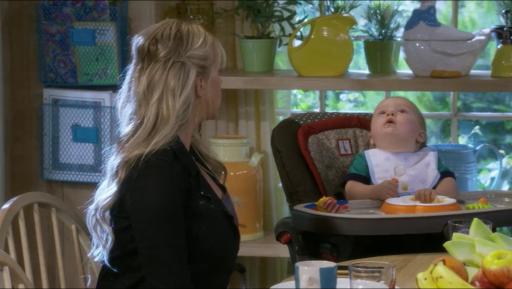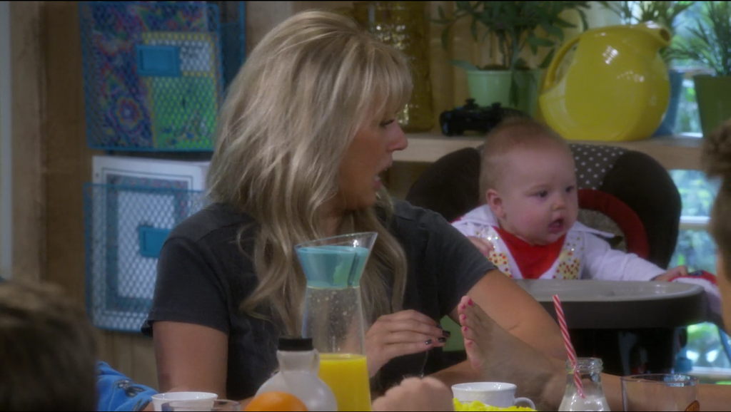 To compliment her comedic, loud self, we see an equally trendy Fiesta Sunflower Yellow Pitcher seated on the shelf in the window. It is only typical that a Fiesta piece should be a part of the eccentric Tanner family’s kitchen as it features the classic, art deco lines and bold 100% lead free color glaze. The coupe, oval shape of this pitcher is not only unique, but easy to fill, carry, pour, and place for any dining occasion.
