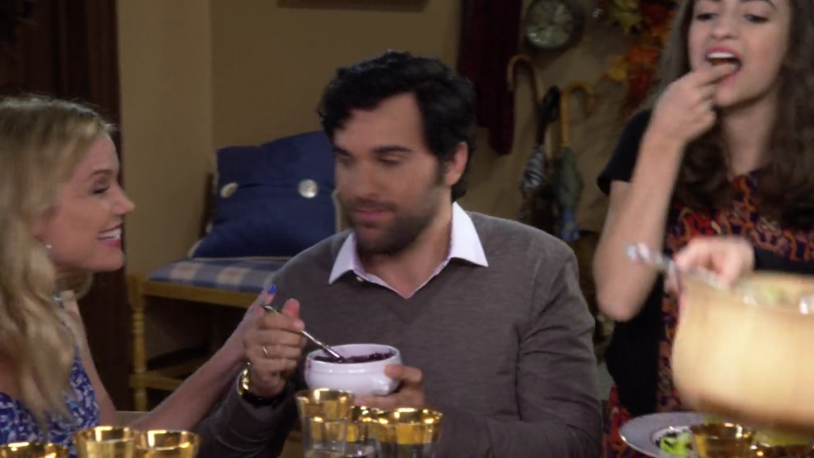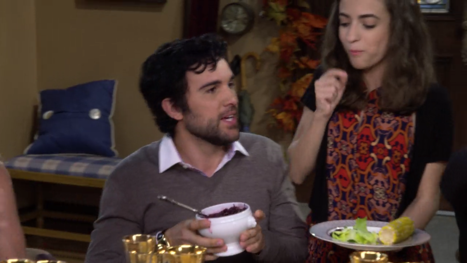 The family enjoys a bounty of Thanksgiving dishes, and the cranberry sauce is served in a white lion’s head handled bowl.
