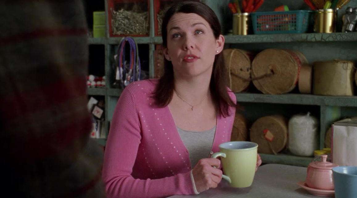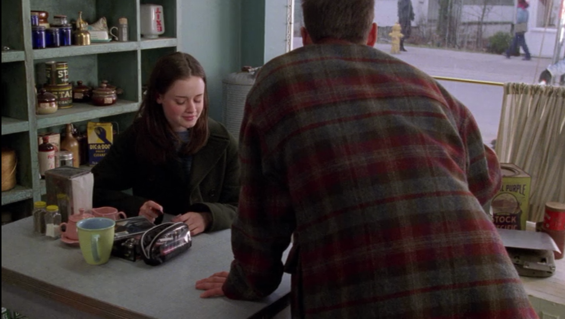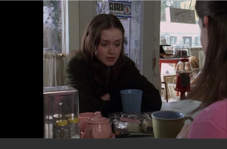 In the first scene of Gilmore Girls, we find Lorelai begging Luke for coffee. As she sits down we see the first of many many china patterns that will be used throughout the show. Fiesta Rose by Homer Laughlin. You can see the Fiesta Rose Sugar Bowl, Creamer, and Tray seated on the table.