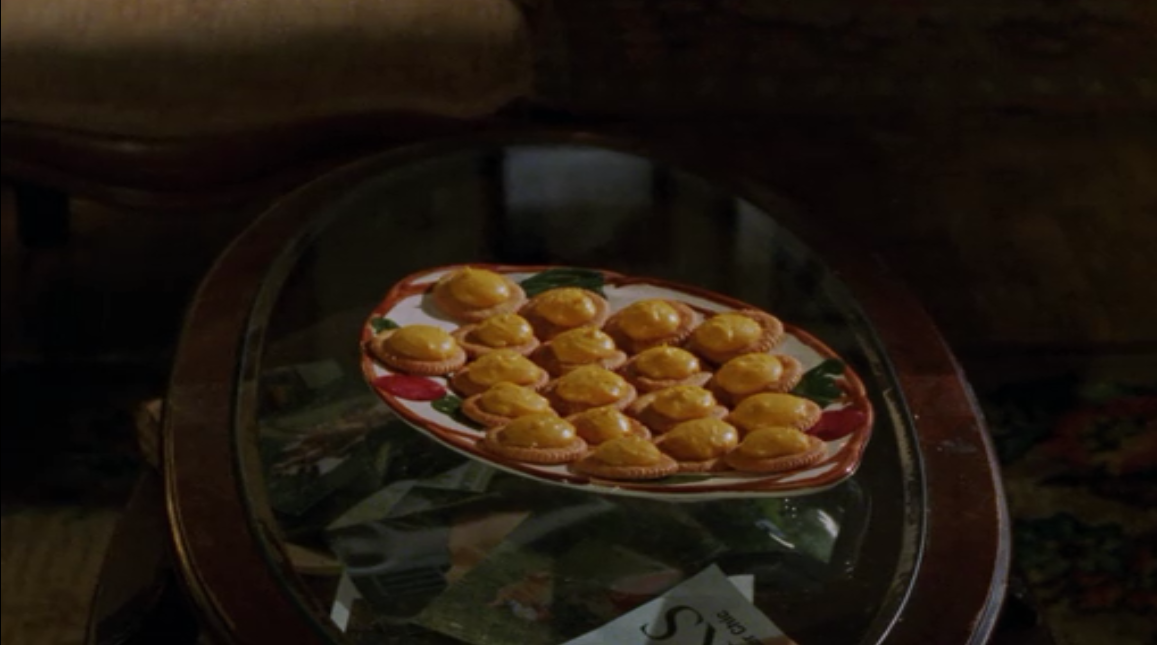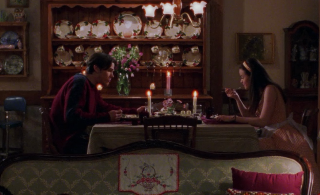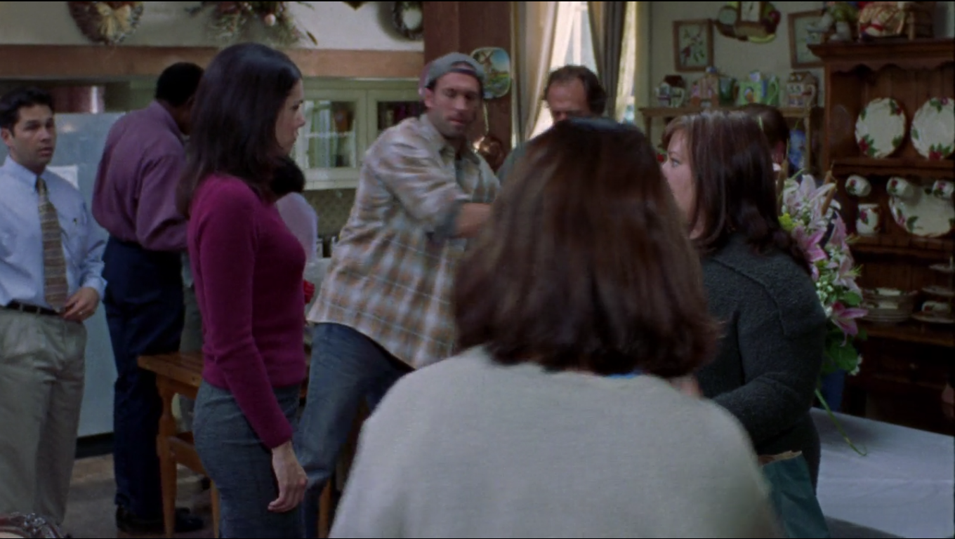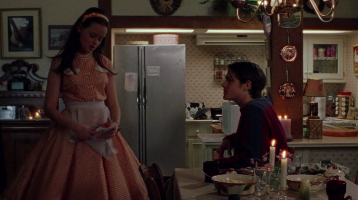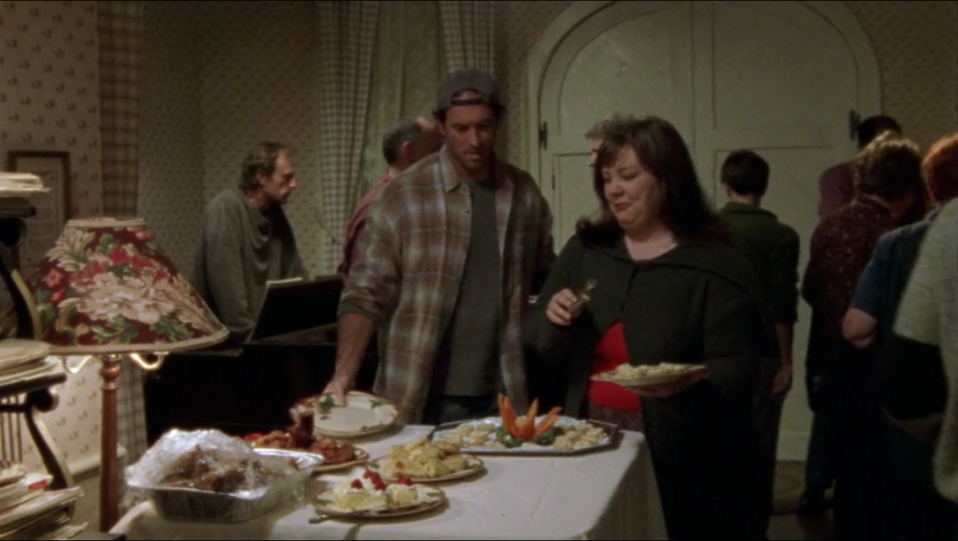 In Season 1 Episode 5, there is a death in Stars Hollow….Cinnamon. Cinnamon is Babette’s much beloved, overly medicated cat. At the wake, we see inside Babette’s home and can start to see the extent of her Franciscan Apple Collection. As Luke and Sookie battle over prime positions on the buffet table, Luke is holding the Apple Oval Platter.