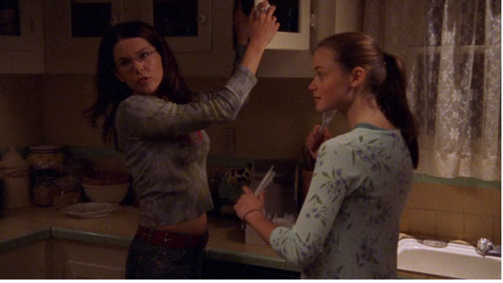 In this specific scene the happy ladies are preparing for a movie night, accompanied by Rory’s boyfriend Dean. As Lorelai and Rory move about the kitchen, fast talking and making quick jokes as is their modus operandi, we see a delightful Pfaltzgraff Village cookie jar seated on the counter. The Pfalzgraff Village pattern, created in the 1970’s, features tan, earthy browns with flourishing folk-art style flowers. This vintage pattern fits perfectly with the hip yet homey Gilmore home.