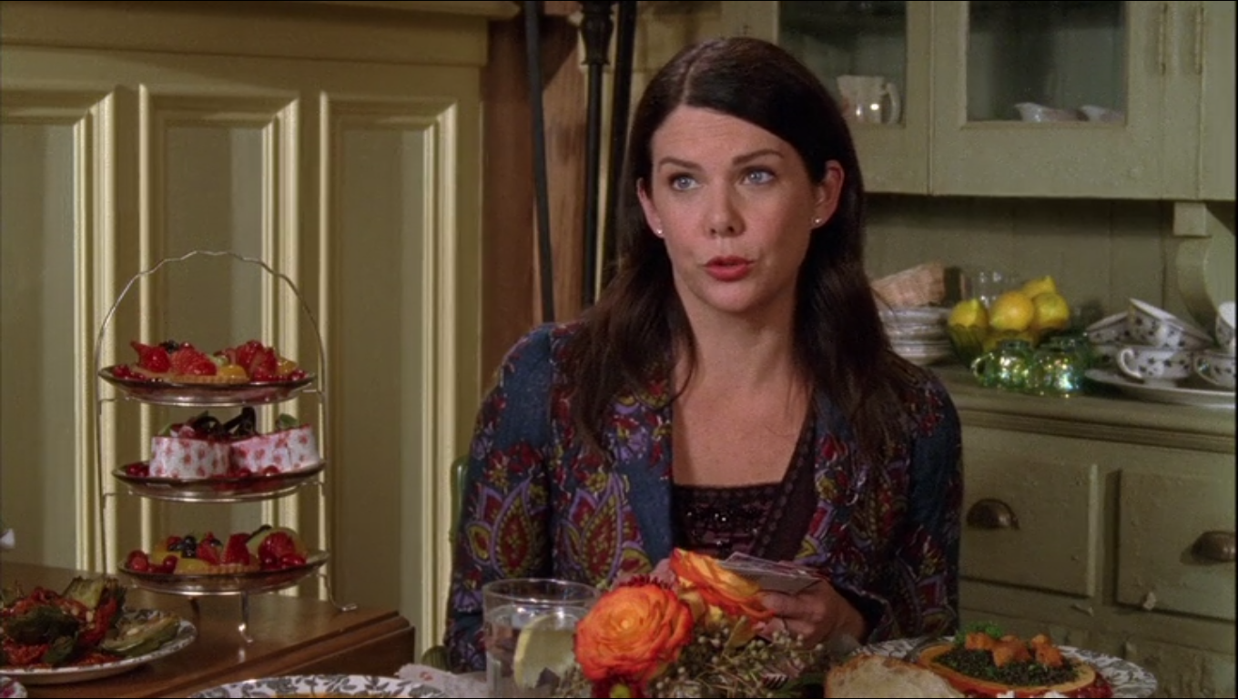 During their second feast, Lorelai breaks the news to Rory that her dad, Chris, has re-surfaced and called to tell Lorelai exciting news. In the Gimore Girls way, the two go back and forth, quickly surmising what this “good news” could possibly be. Lorelai suggests that his three year old daughter, Gigi, has become a musical prodigy and Chris would like to invite Lorelai and Rory to witness her premier at Carnegie Hall, to which Rory responds, “Freakishly talented three year old flugelhorn player prodigy discovered!” They decide Lorelai has to return his call and meet with him in person to discover what the positive news is.