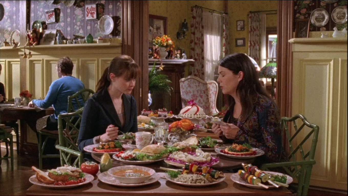 In celebration of Rory’s return, Lorelai and Rory romp around Stars Hollow visiting their favorite spots. First stop, Luke’s Diner for a dramatic, multi-plated breakfast. Second stop, an equally large lunch at the Dragonfly Inn, created by the over excited, hyperventilating Sooki.