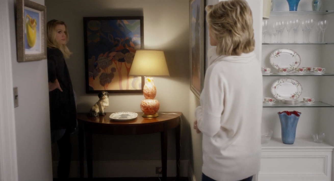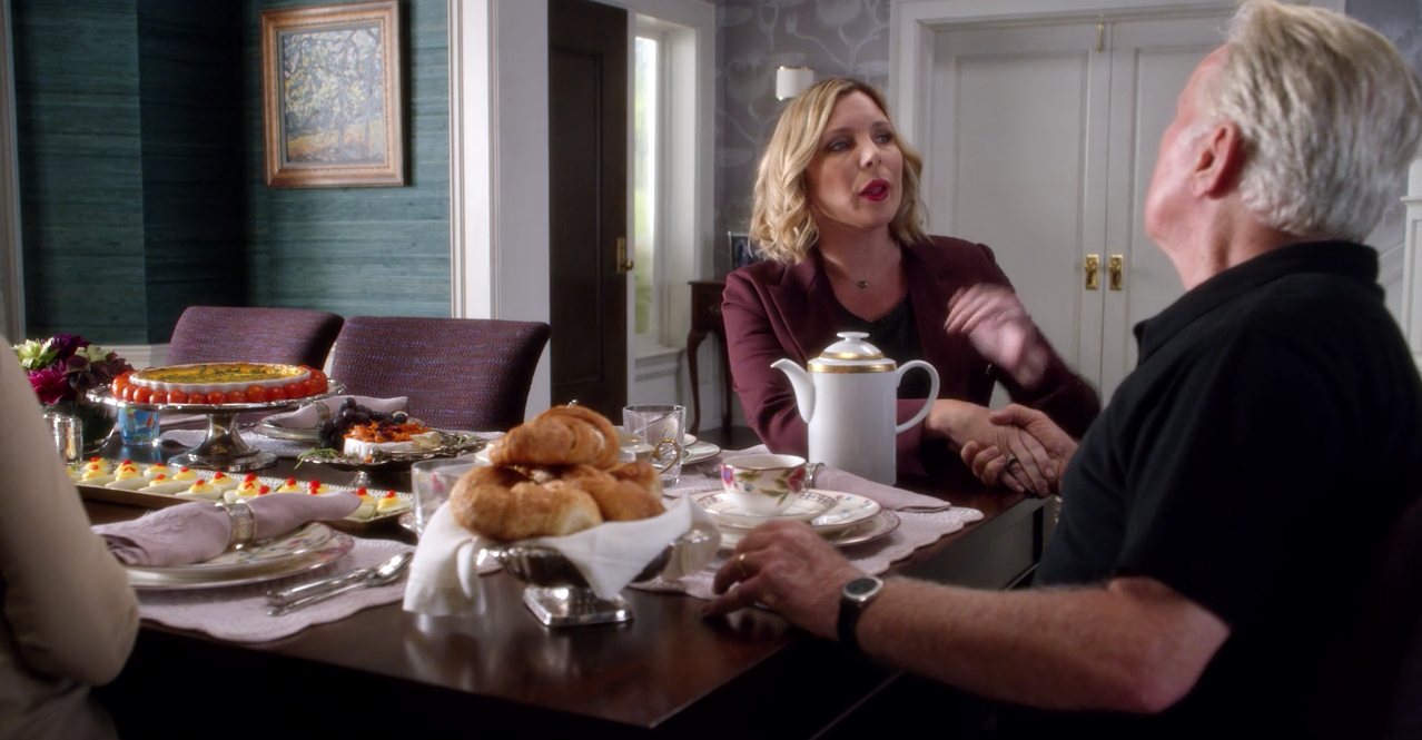 The brunch table is set with the Bouvier china, and additional pieces can be seen in the built-in hutch to the left of the fireplace. The Bouvier pattern features blooms with bright florals and delicate tendrils of buds and leaves accented with shimmering mica and a platinum trim. We can imagine Grace selecting this pattern in her role as First Lady of the Hanson Household. On the table, you will also find pieces of Lenox Republic interspersed amongst the china which you can read about in more detail here.