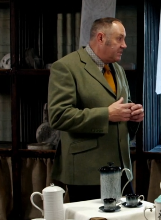 As the judges discuss the challenge, they stand behind a table filled with a veritable pantheon of British pottery. Spode, Royal Doulton, Royal Worcester, Molly Hatch, Denby, Portmeirion, and Hannah Turner.