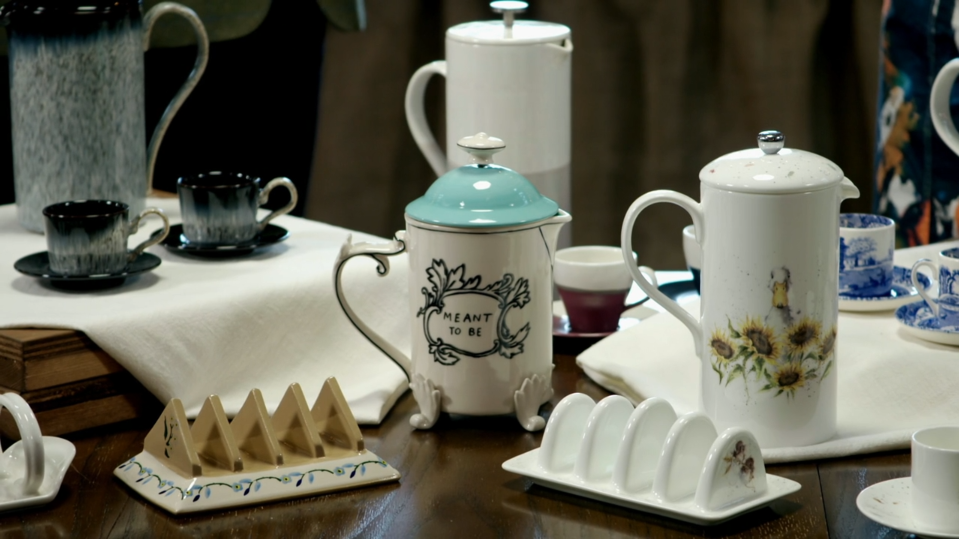 As the judges discuss the challenge, they stand behind a table filled with a veritable pantheon of British pottery. Spode, Royal Doulton, Royal Worcester, Molly Hatch, Denby, Portmeirion, and Hannah Turner.