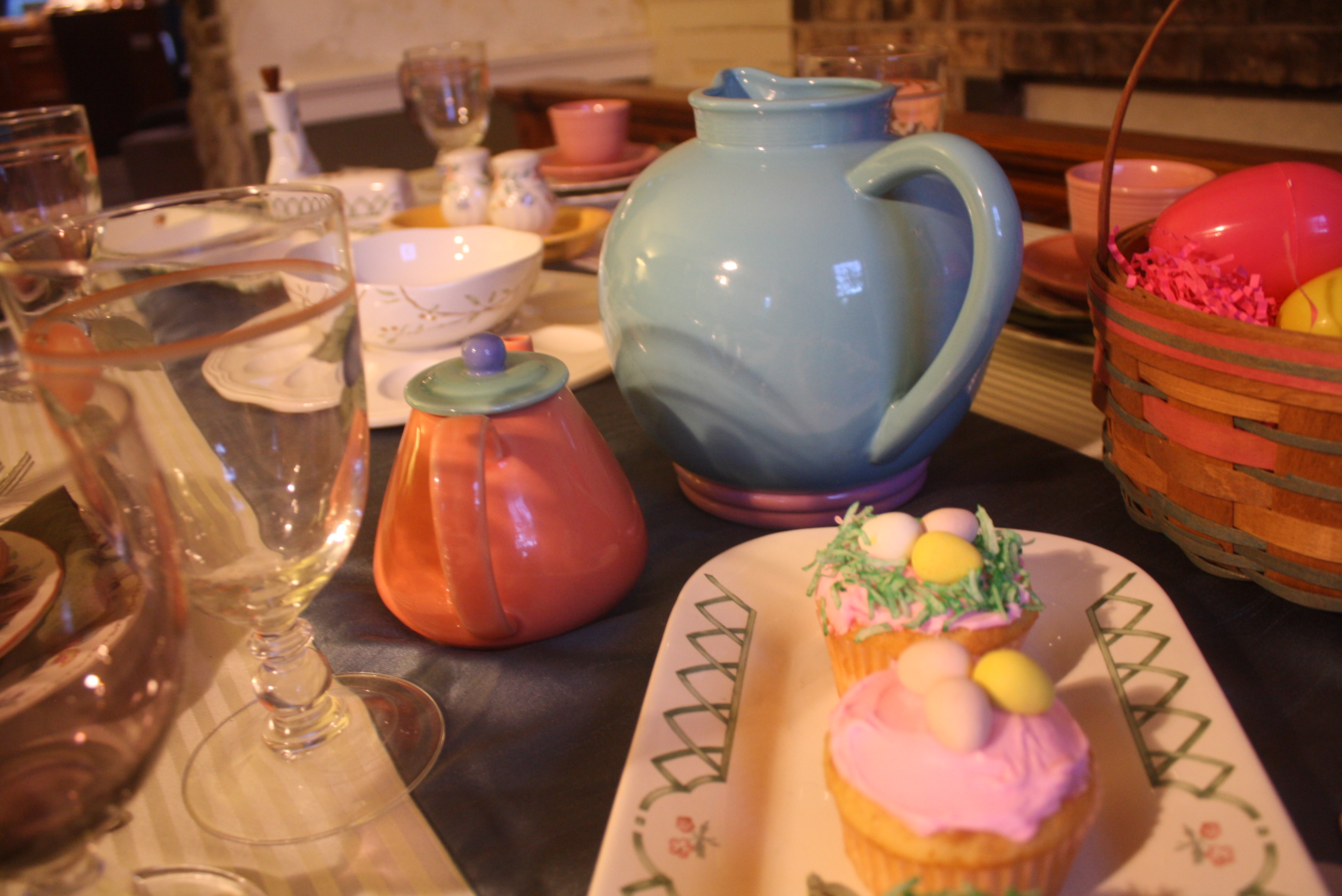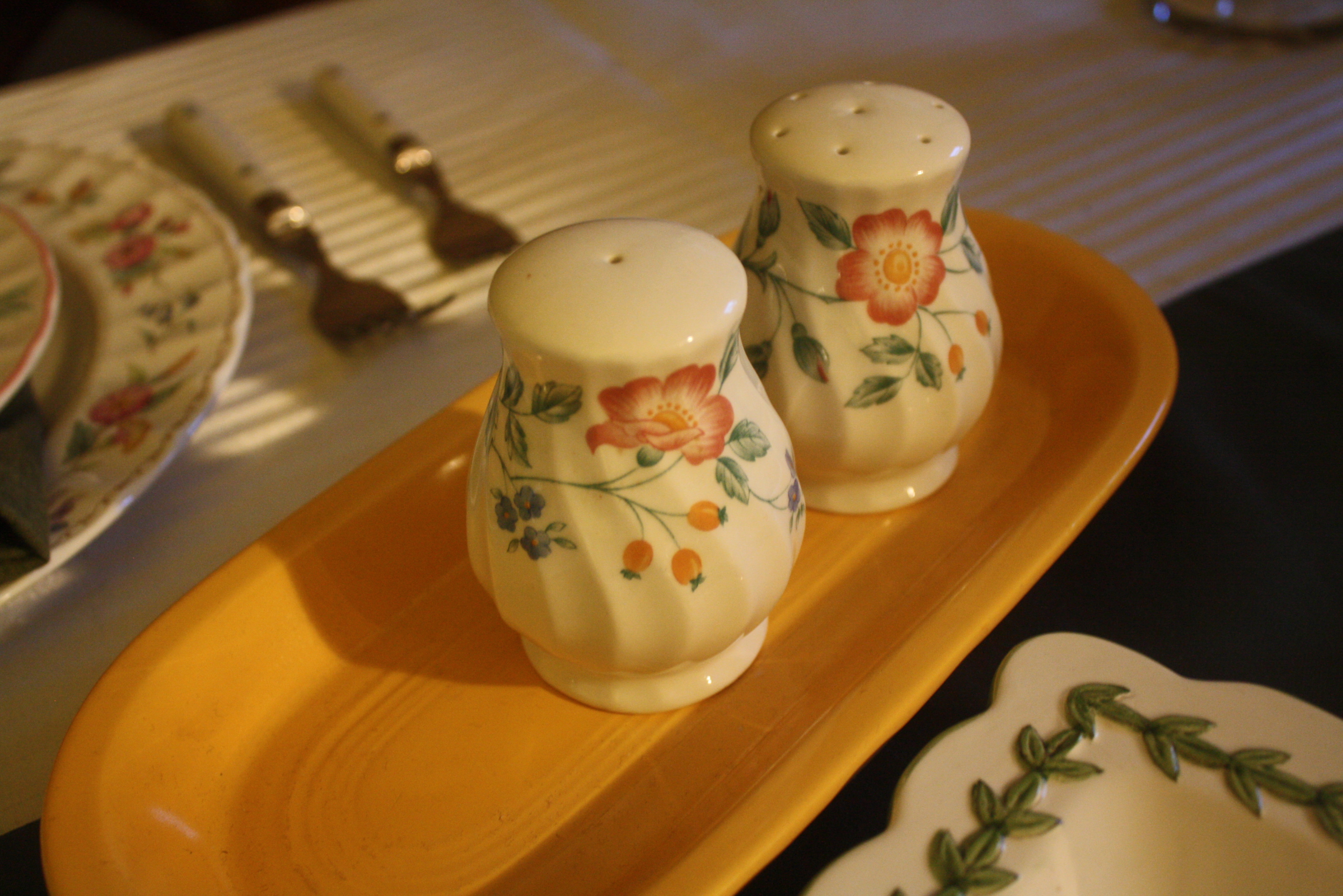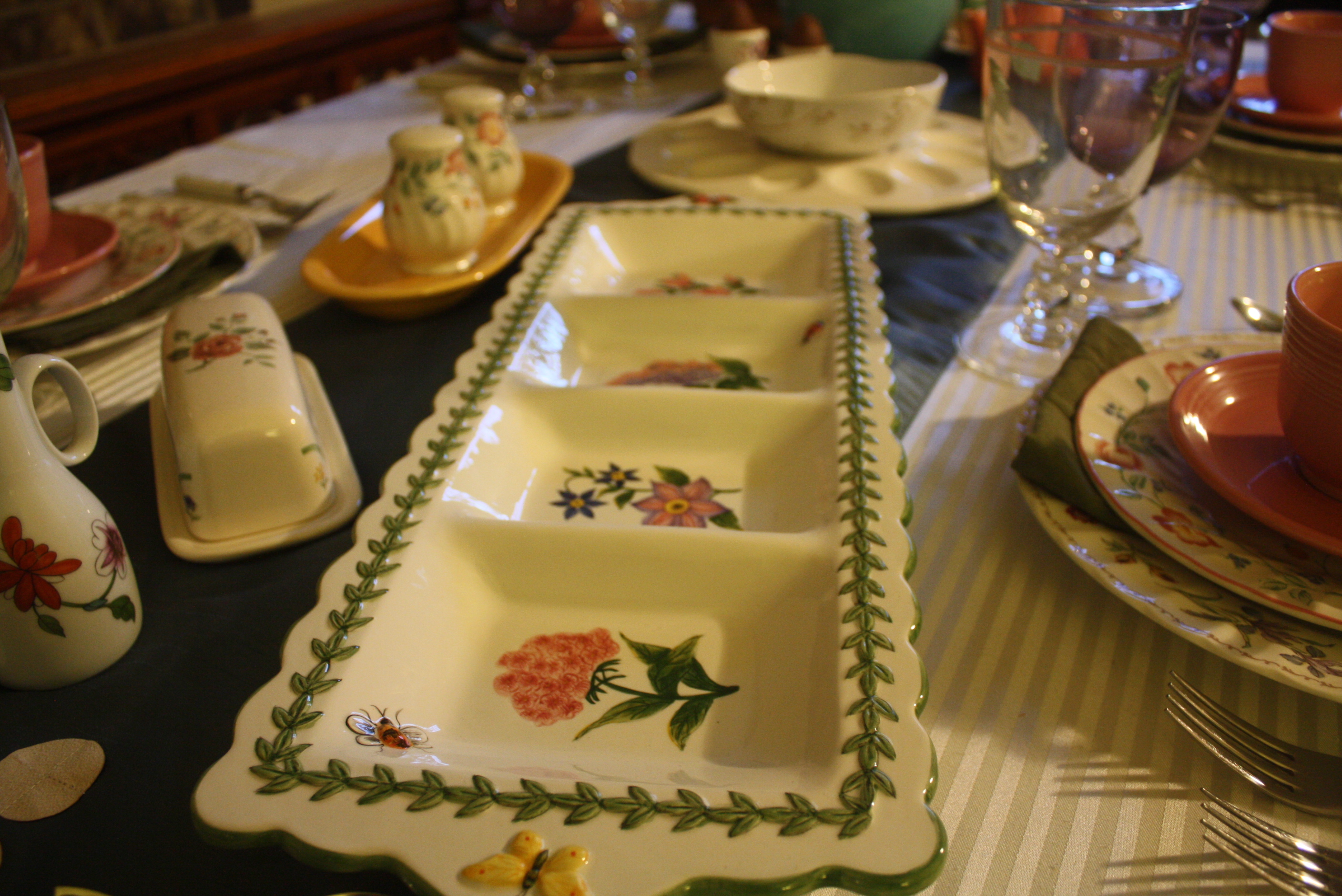 To add a fun springtime accent to our Mikasa Antique White deviled egg plate, we topped it with a 222 Fifth Early Bird bowl. Pfaltzgraff’s Garden Trellis made an appearance both with the butter dish and the rectangular tray, which is holding our festive cupcakes. Homer Laughlin’s Old Yellow utility tray is showing it’s utility by serving as a tray for the Churhill Briar Rose salt and pepper shakers.