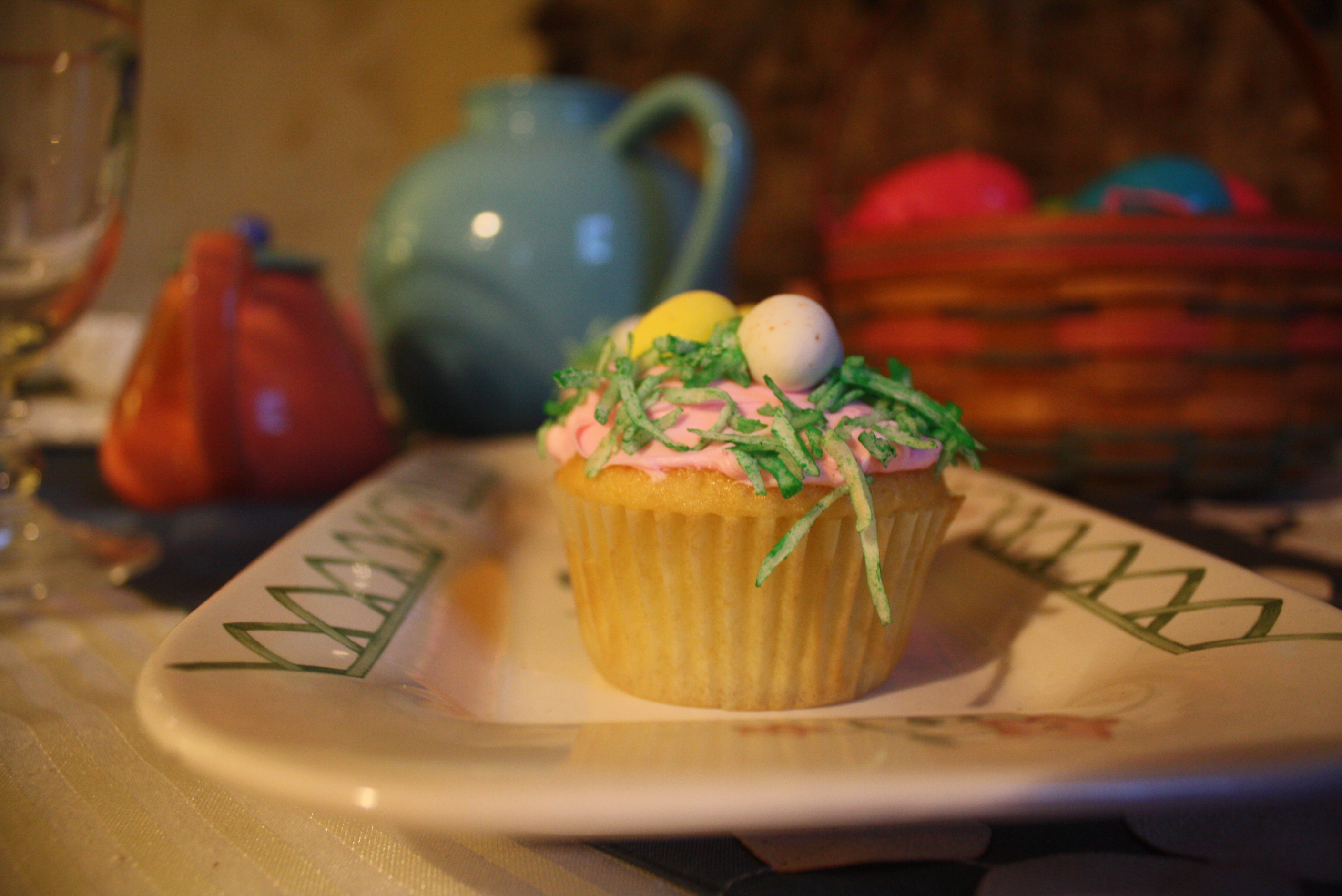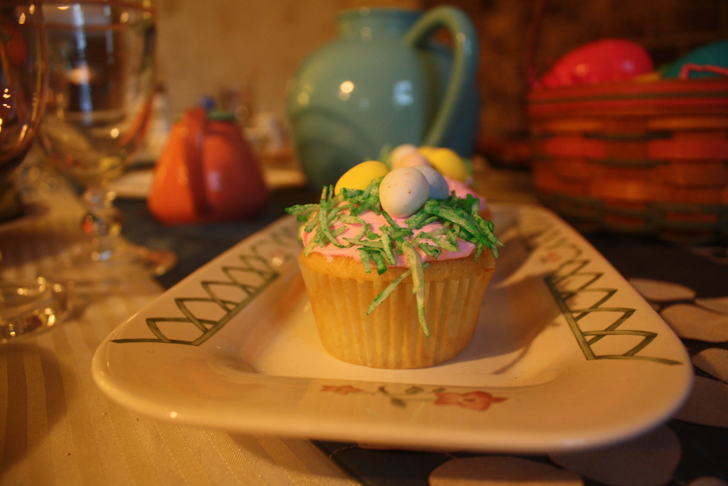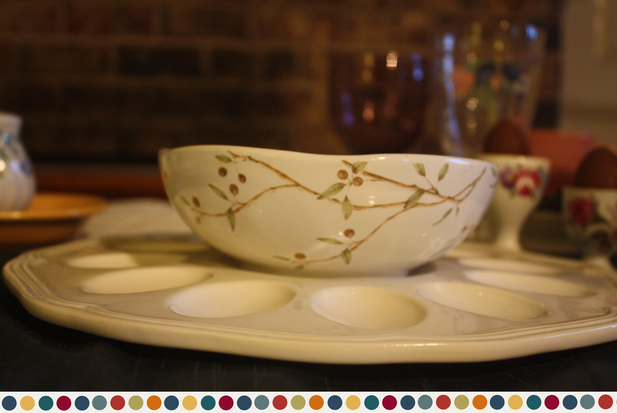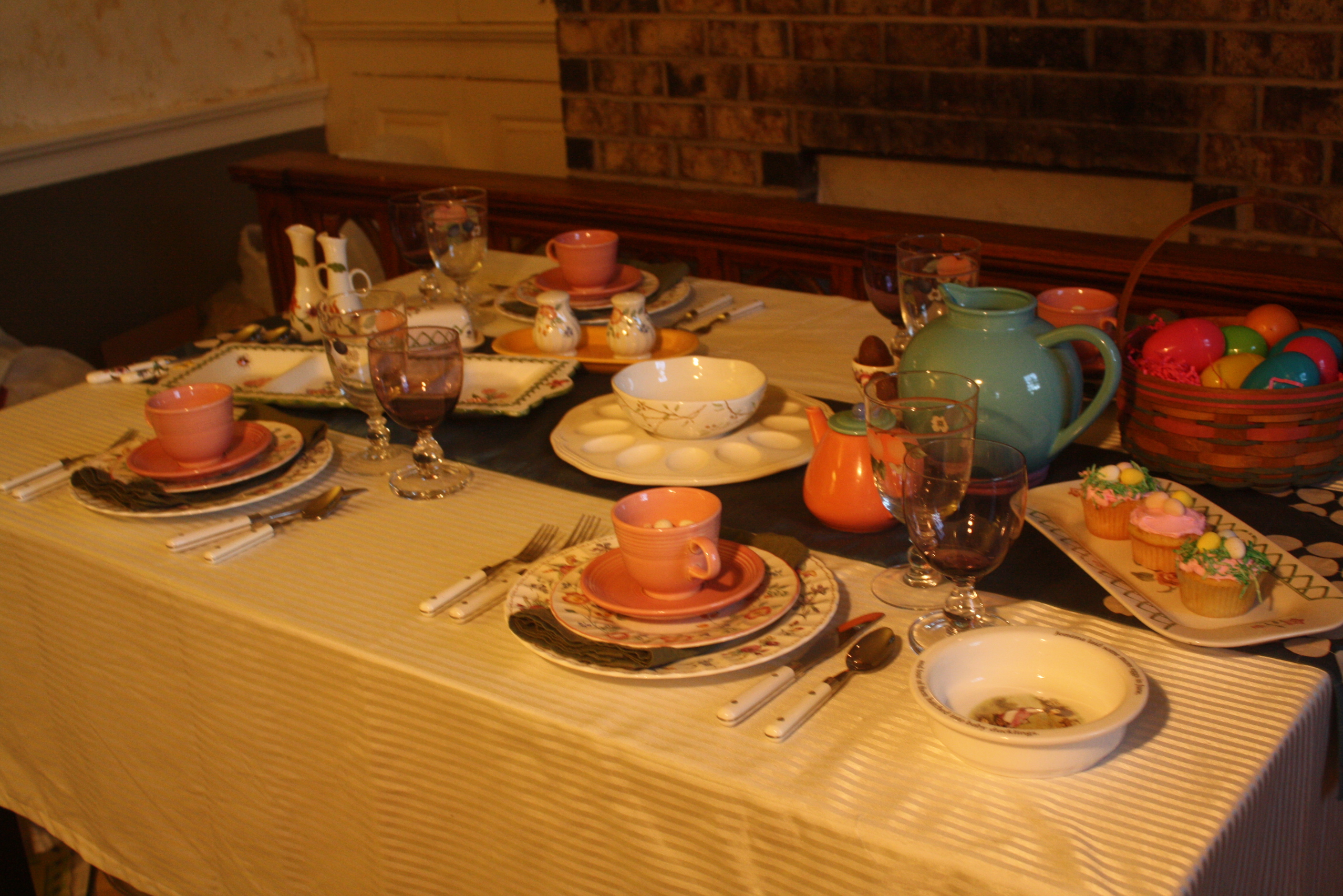 To add a fun springtime accent to our Mikasa Antique White deviled egg plate, we topped it with a 222 Fifth Early Bird bowl. Pfaltzgraff’s Garden Trellis made an appearance both with the butter dish and the rectangular tray, which is holding our festive cupcakes. Homer Laughlin’s Old Yellow utility tray is showing it’s utility by serving as a tray for the Churhill Briar Rose salt and pepper shakers.