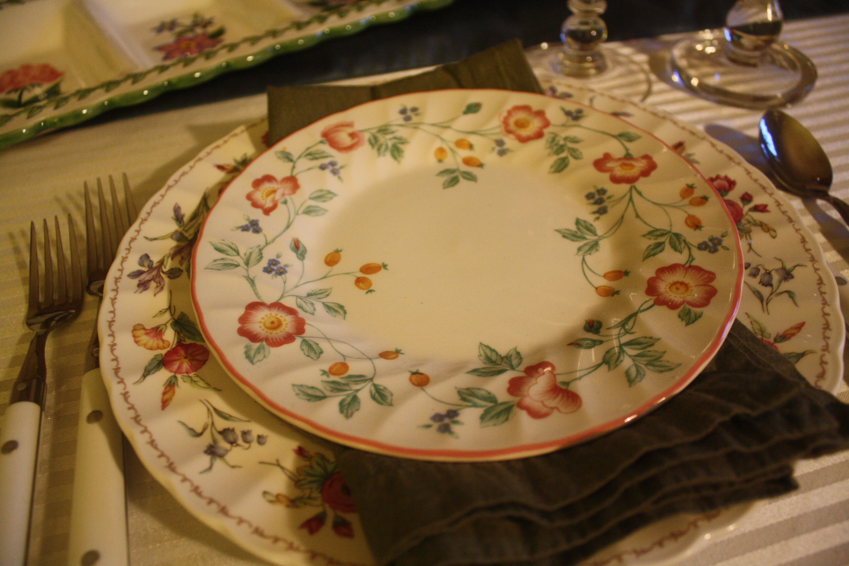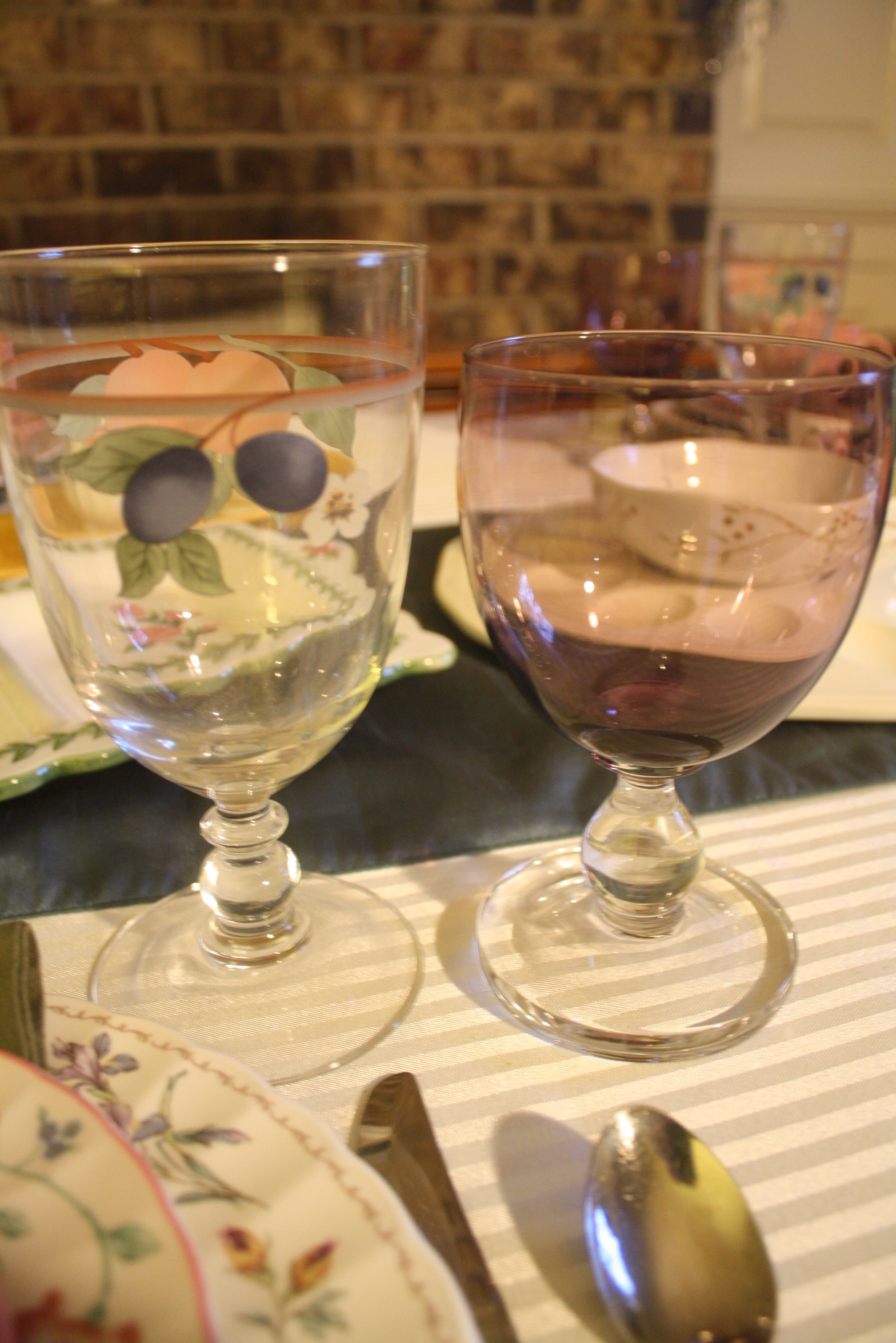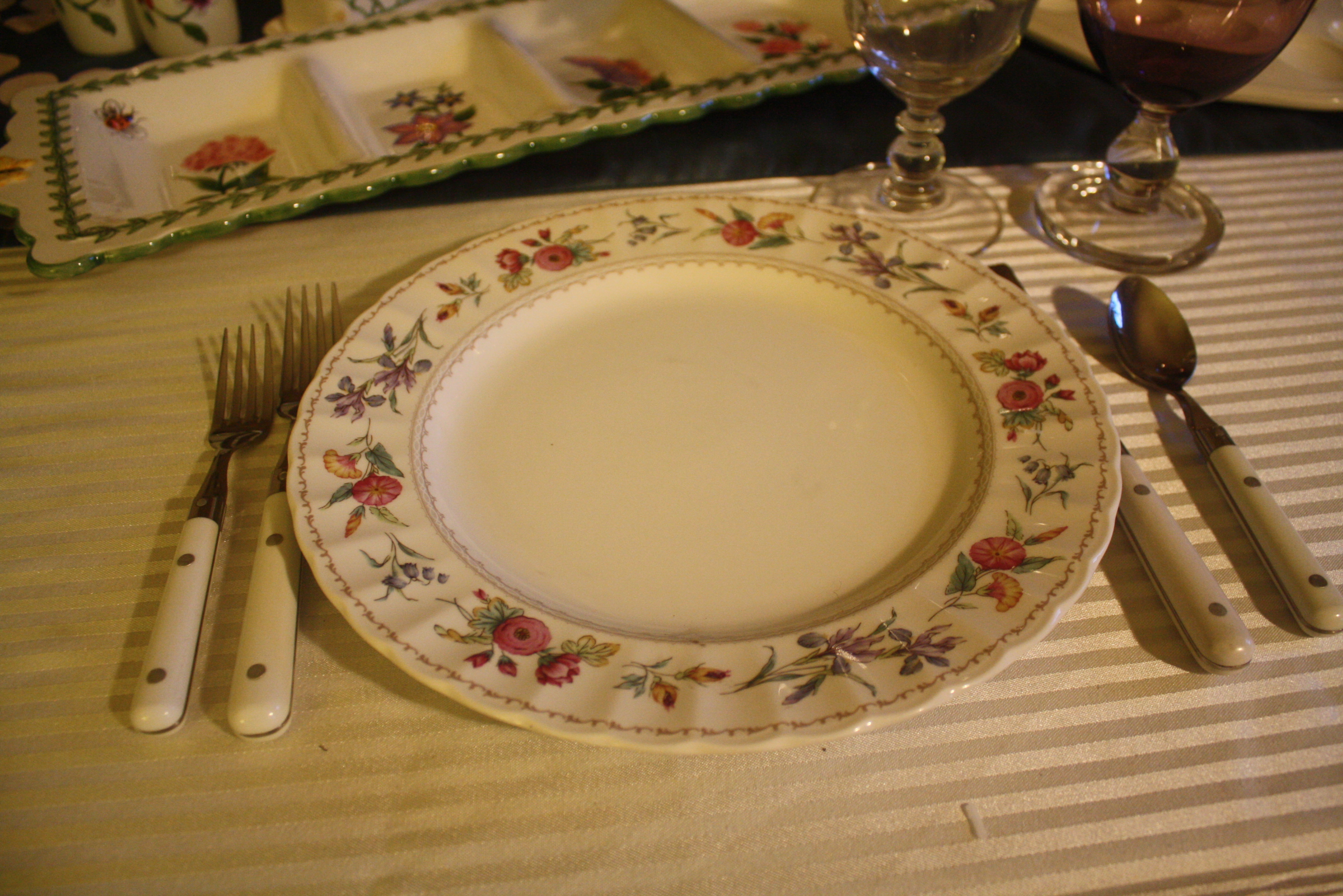 The wonderful thing about floral patterns (in addition to their cheerful color) is how easily they can be mixed and matched. For this table’s main place settings, we used Mikasa Brywood Dinner Plates, Churchill Briar Rose Salad Plates, Fiesta Rose Cups and Saucers, Dansk Hanna Amethyst (Purple) glasses, Mikasa Fruit Panorama Glasses, and Farberware Colours White Flatware.