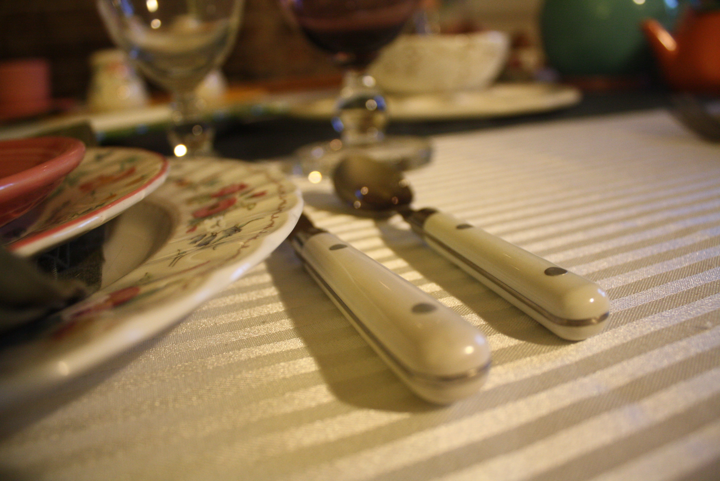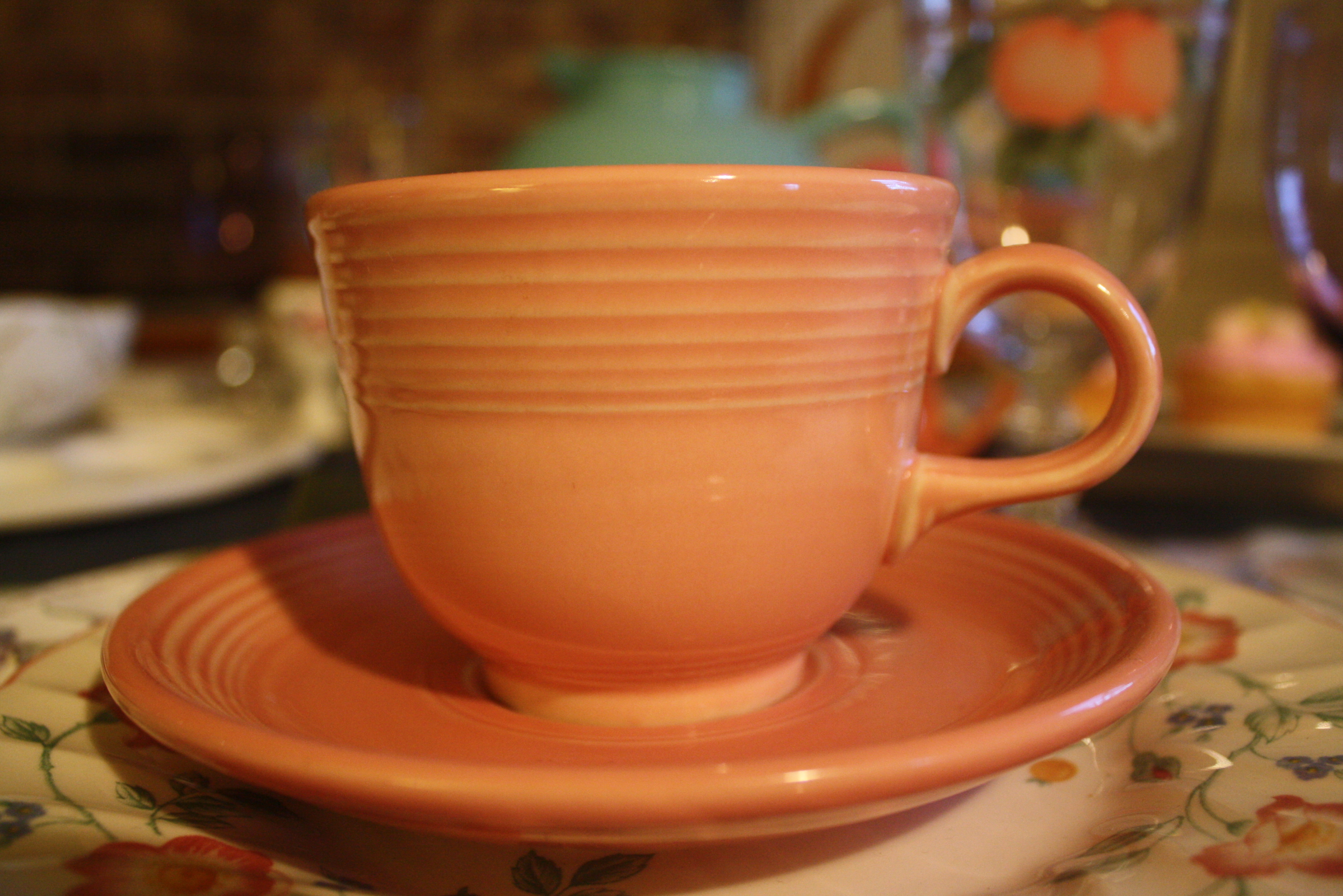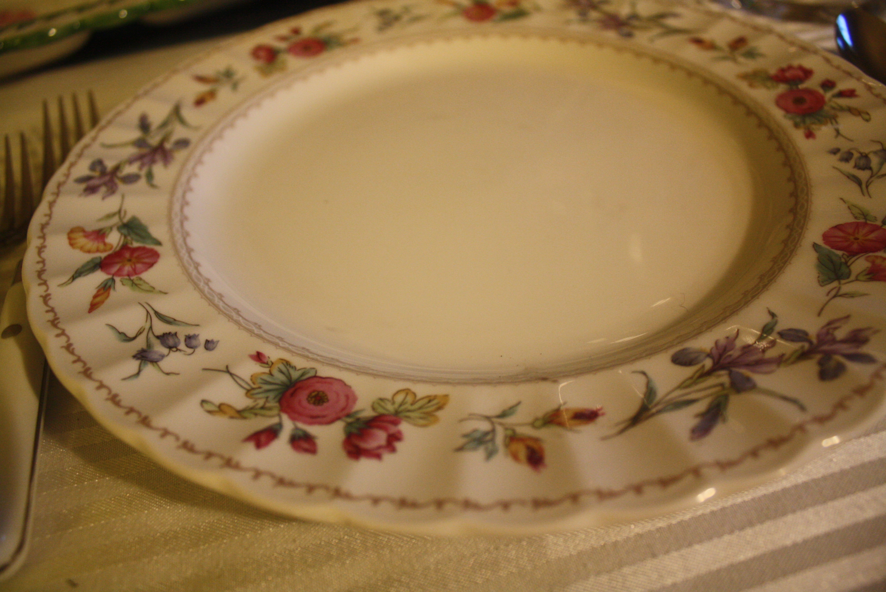The wonderful thing about floral patterns (in addition to their cheerful color) is how easily they can be mixed and matched. For this table’s main place settings, we used Mikasa Brywood Dinner Plates, Churchill Briar Rose Salad Plates, Fiesta Rose Cups and Saucers, Dansk Hanna Amethyst (Purple) glasses, Mikasa Fruit Panorama Glasses, and Farberware Colours White Flatware.