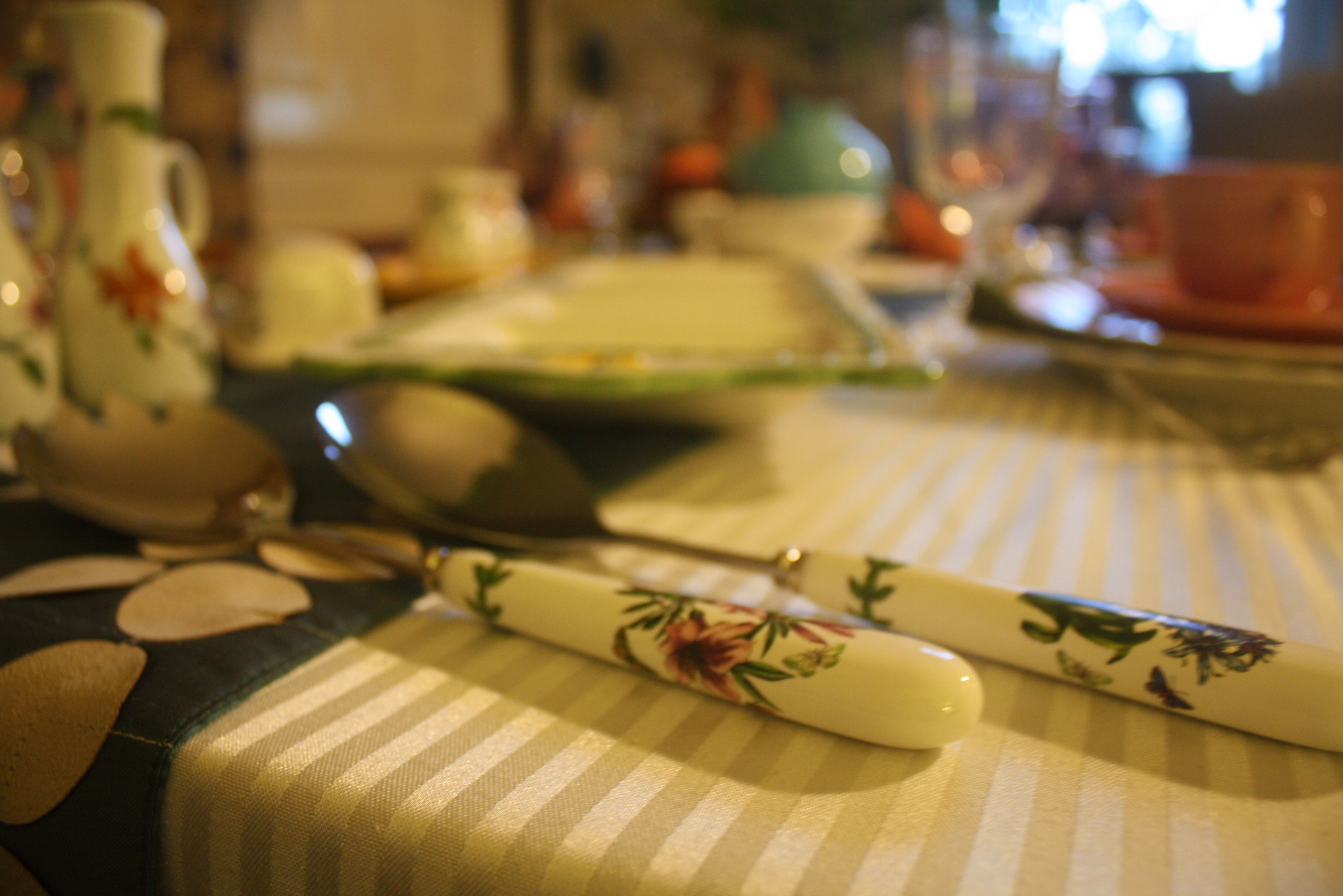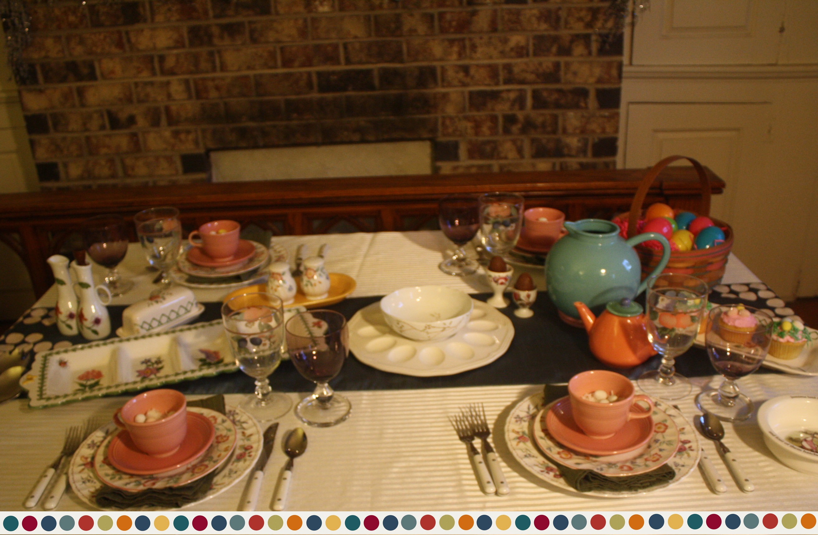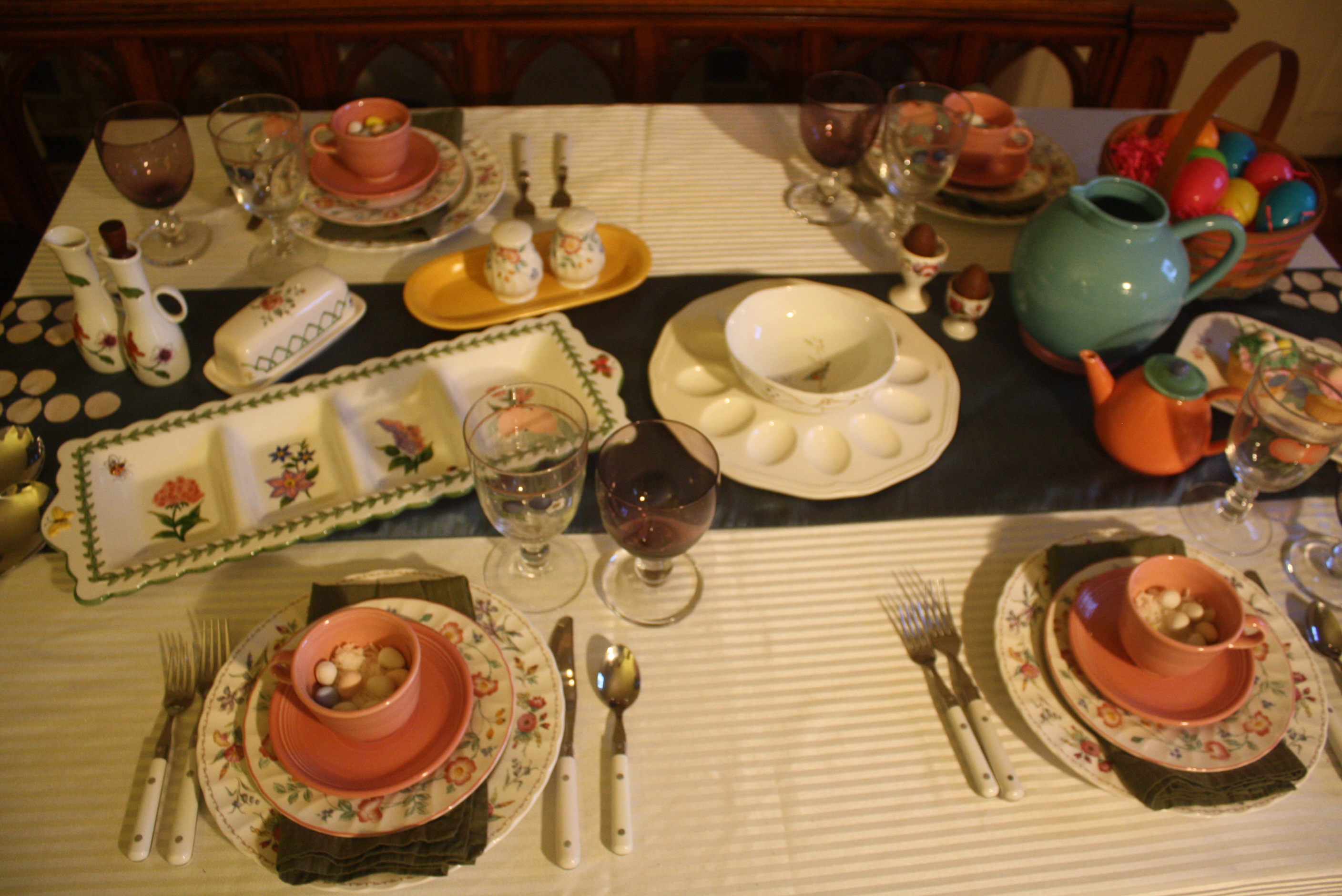 Additional spring color is added with Lindt-Stymeist Colorways teapot and creamer, while Portmeirion Botanic Garden salad serving utensils and Royal Worcester Astley oil and vinegar cruets bring in even more fantastic florals. Royal Doulton’s World of Beatrix Potter Nursery Rhyme bowl gives the table a bit of playful whimsy. The look is finished off with a 19th Century Brand Handmade Basket filled with Easter eggs and a set of vintage egg cups that we found at a local consignment shop.