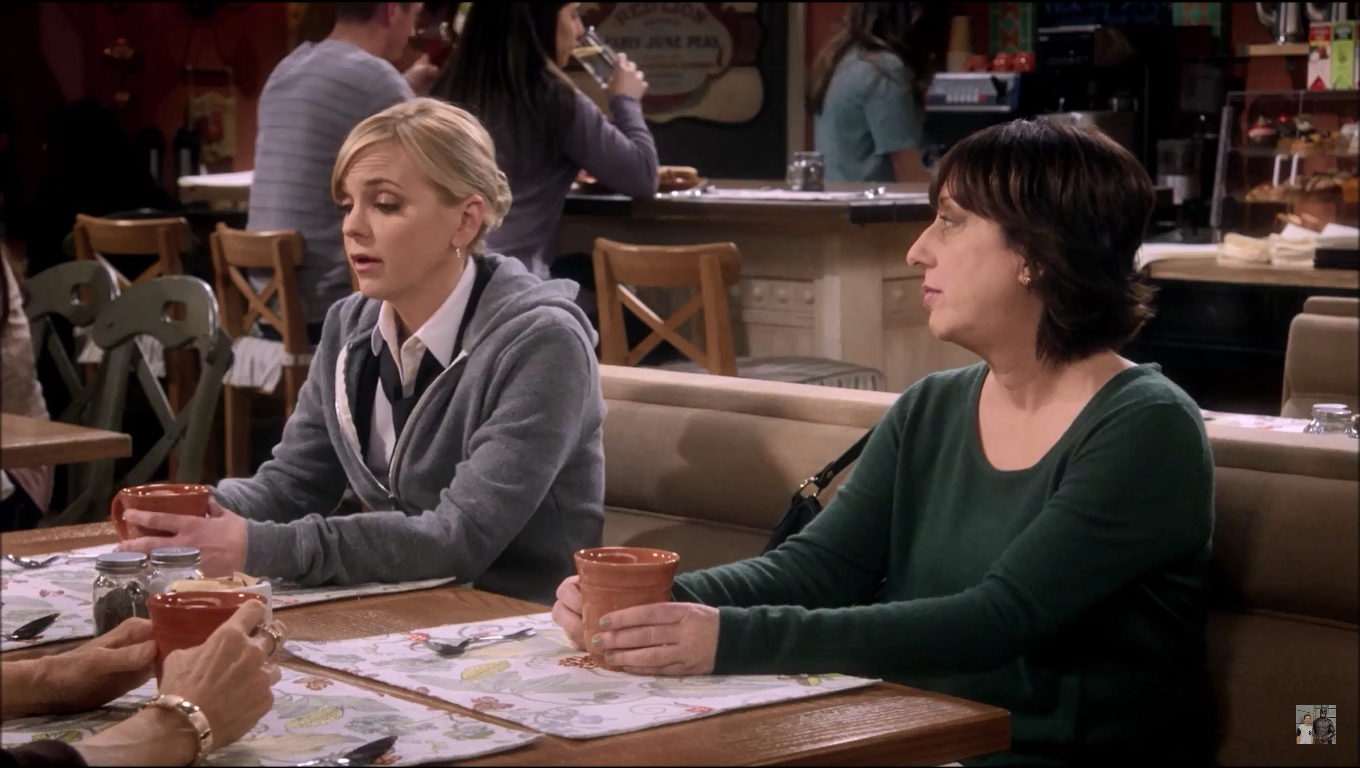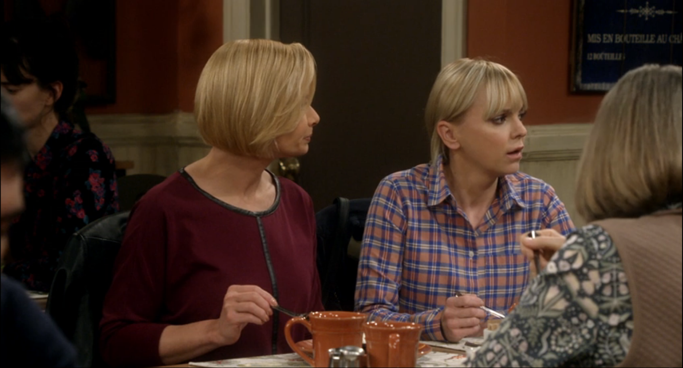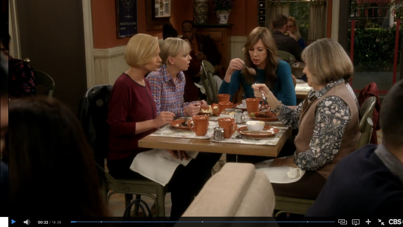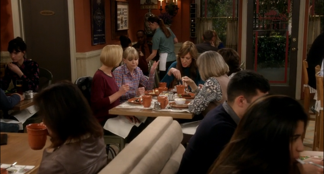 For the ladies of Mom, this place is the Bistro. Here, they discuss the trials and tribulations of sobriety, men, and each other. The food at the bistro has been served on Pottery Barn Cambria Persimmon dishware throughout Seasons 3 and 4. (In Season 1, they used Threshold Wellsbrigde Brick.) Cambria has been offered in 12 colors, and Persimmon was discontinued in 2016. The Cambria dishes were part of Christy’s 3 Years Sober Celebration in Season 3, Episode 22. And when Jill is discussing her options on adoption in Season 3, Episode 18. While the Wellsbridge dishes were there when Marjorie told the ladies that she has breast cancer, in Season 1, Episode 11.