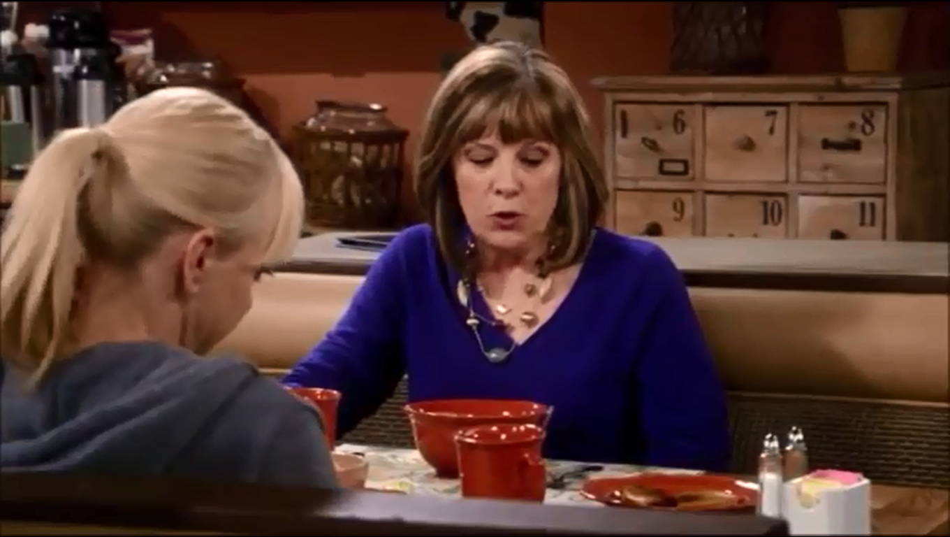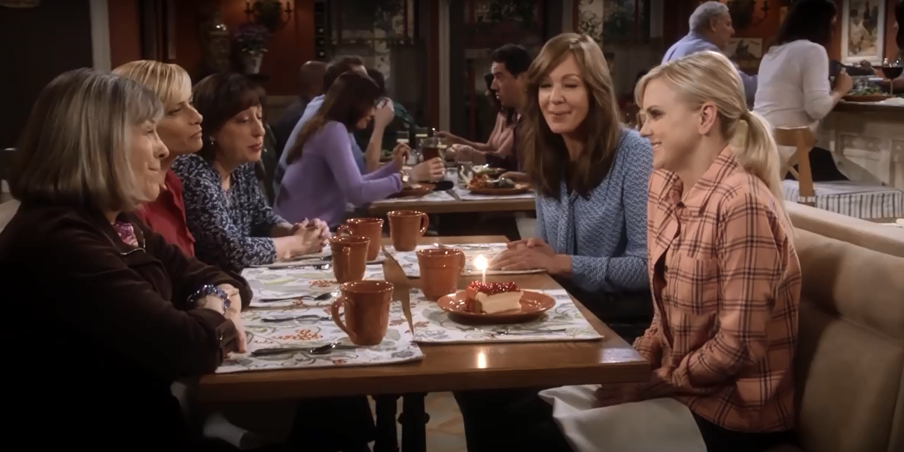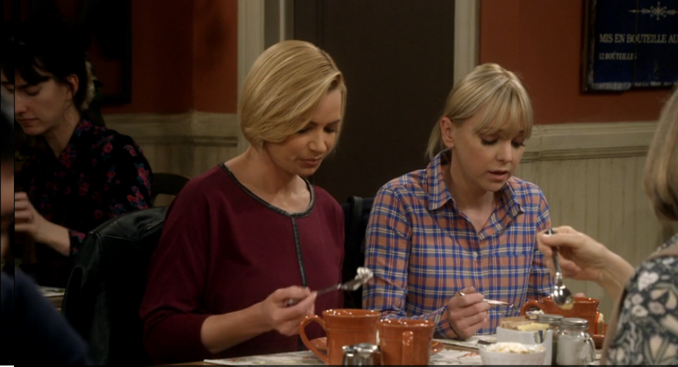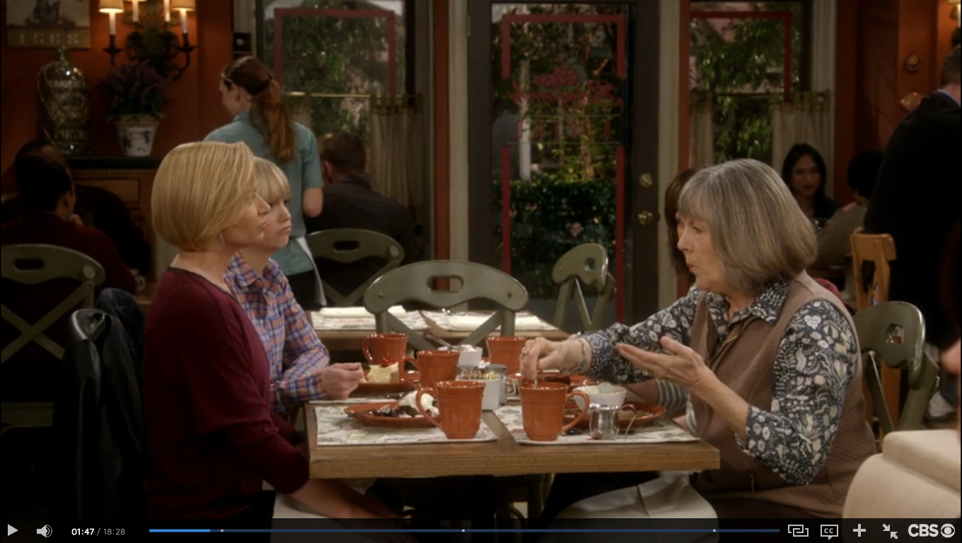 For the ladies of Mom, this place is the Bistro. Here, they discuss the trials and tribulations of sobriety, men, and each other. The food at the bistro has been served on Pottery Barn Cambria Persimmon dishware throughout Seasons 3 and 4. (In Season 1, they used Threshold Wellsbrigde Brick.) Cambria has been offered in 12 colors, and Persimmon was discontinued in 2016. The Cambria dishes were part of Christy’s 3 Years Sober Celebration in Season 3, Episode 22. And when Jill is discussing her options on adoption in Season 3, Episode 18. While the Wellsbridge dishes were there when Marjorie told the ladies that she has breast cancer, in Season 1, Episode 11.