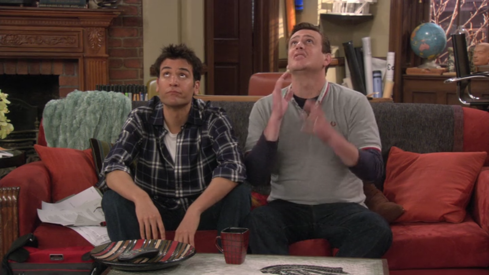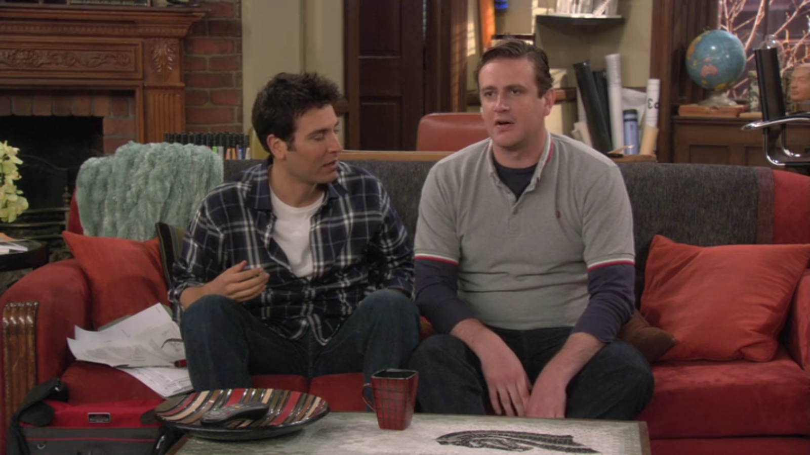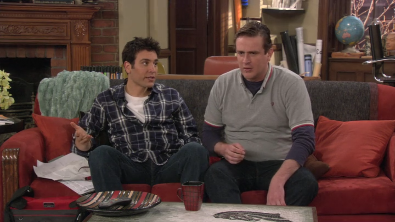 In Ted and Robin’s apartment, Marshall and Ted sit on the couch complaining about the incessant “bagpiping,” while a Home Tamarask mug listens in on the conversation. This striking mug features dark red squares outlined by clean black lines.