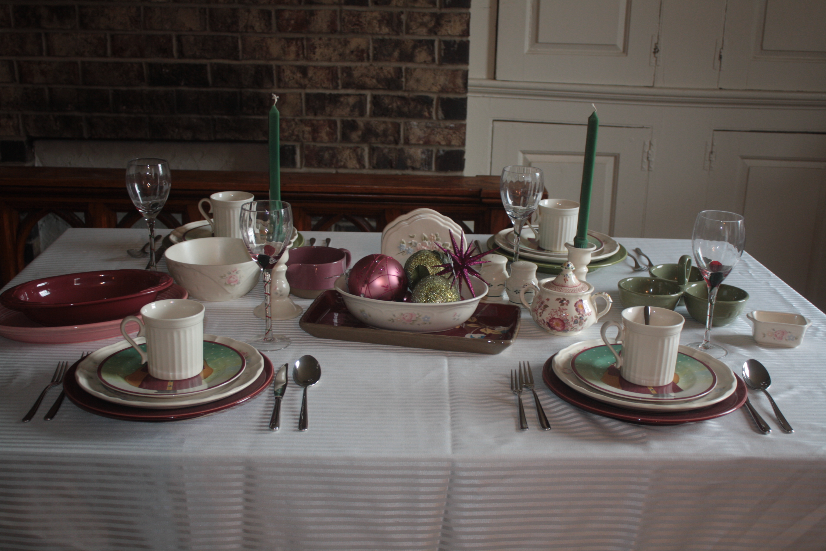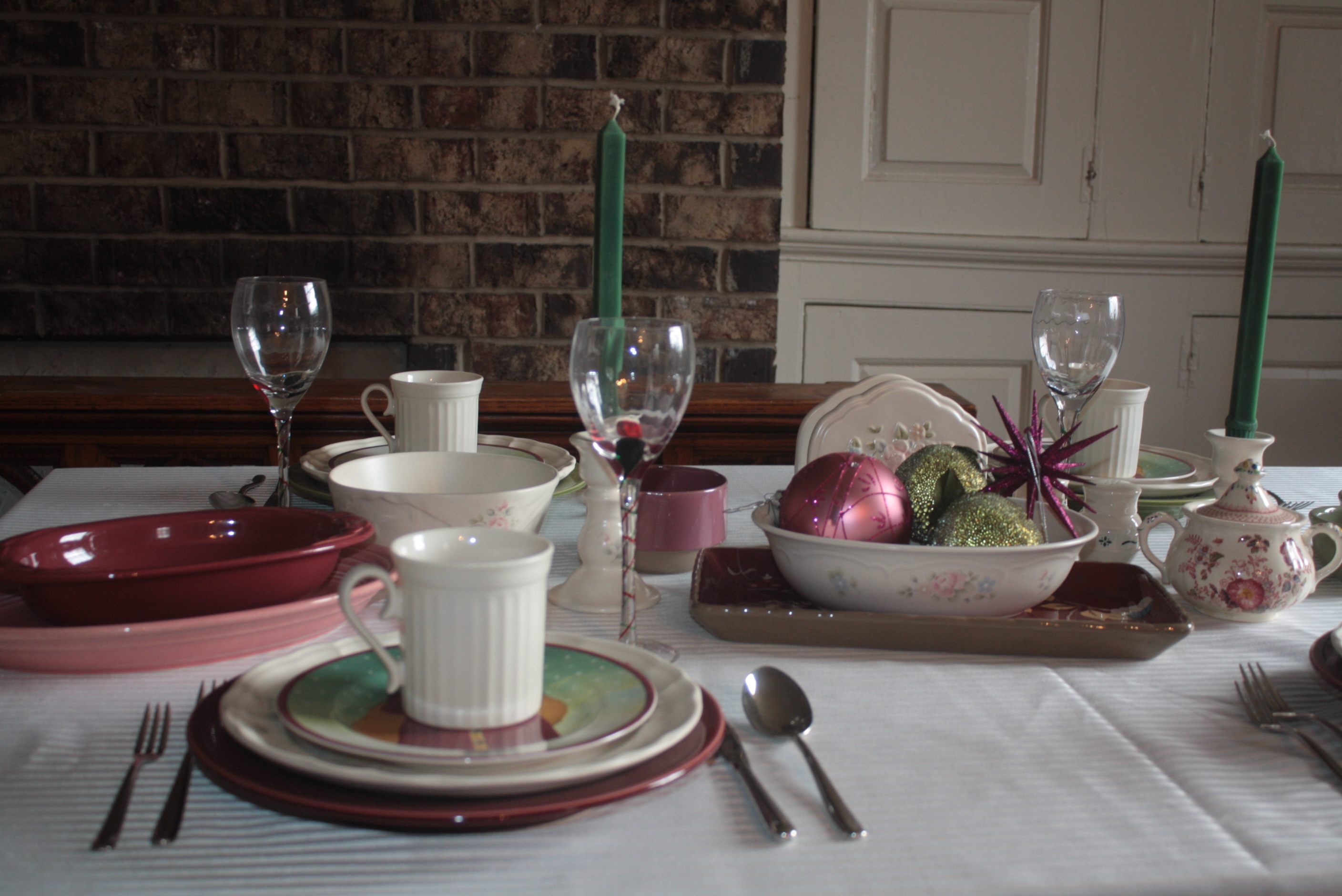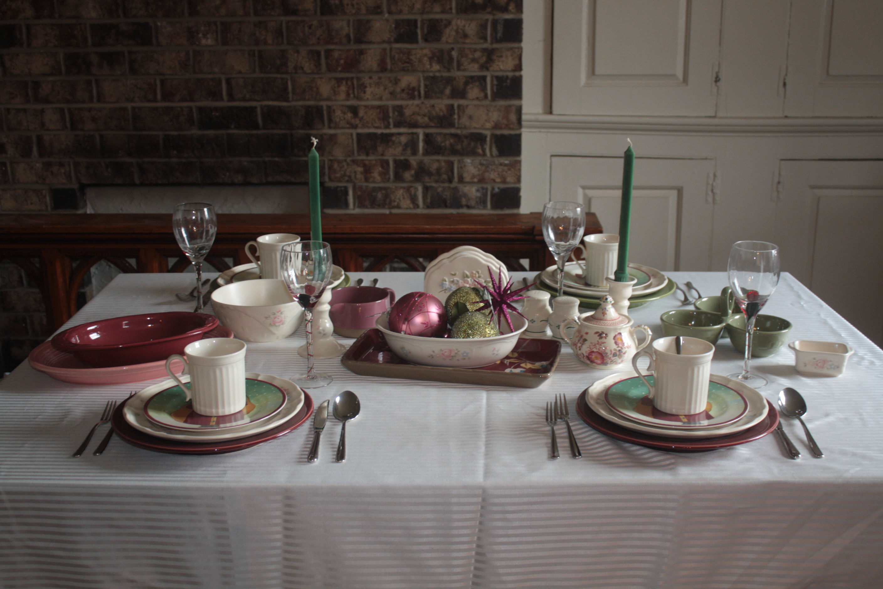 To set this festive holiday table, we took Tea Rose dinner plates and serving pieces, and paired them with deep burgundy, bright pink, creamy ivory, and olive green accent pieces. The result is a fun Christmas table, without having to purchase another whole set of dishes!