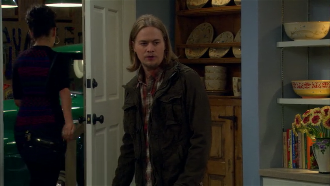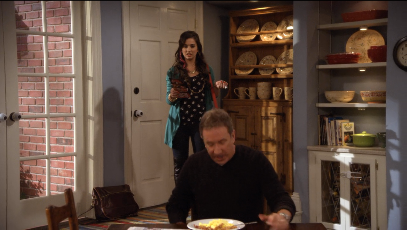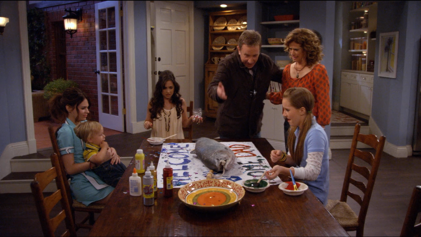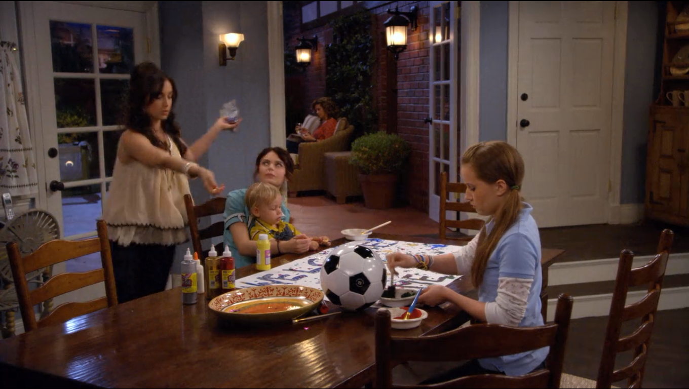 In this opening scene, the girls are making a Welcome Home sign for their dad, Mike. With glitter flying (turning Eve’s soccer ball into a disco ball), a large American Simplicity Villa centerpiece bowl is seen in the center of the table. On the shelf a Villa vegetable serving bowl is also visible.
