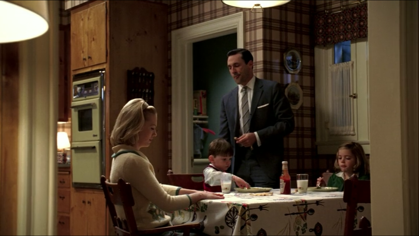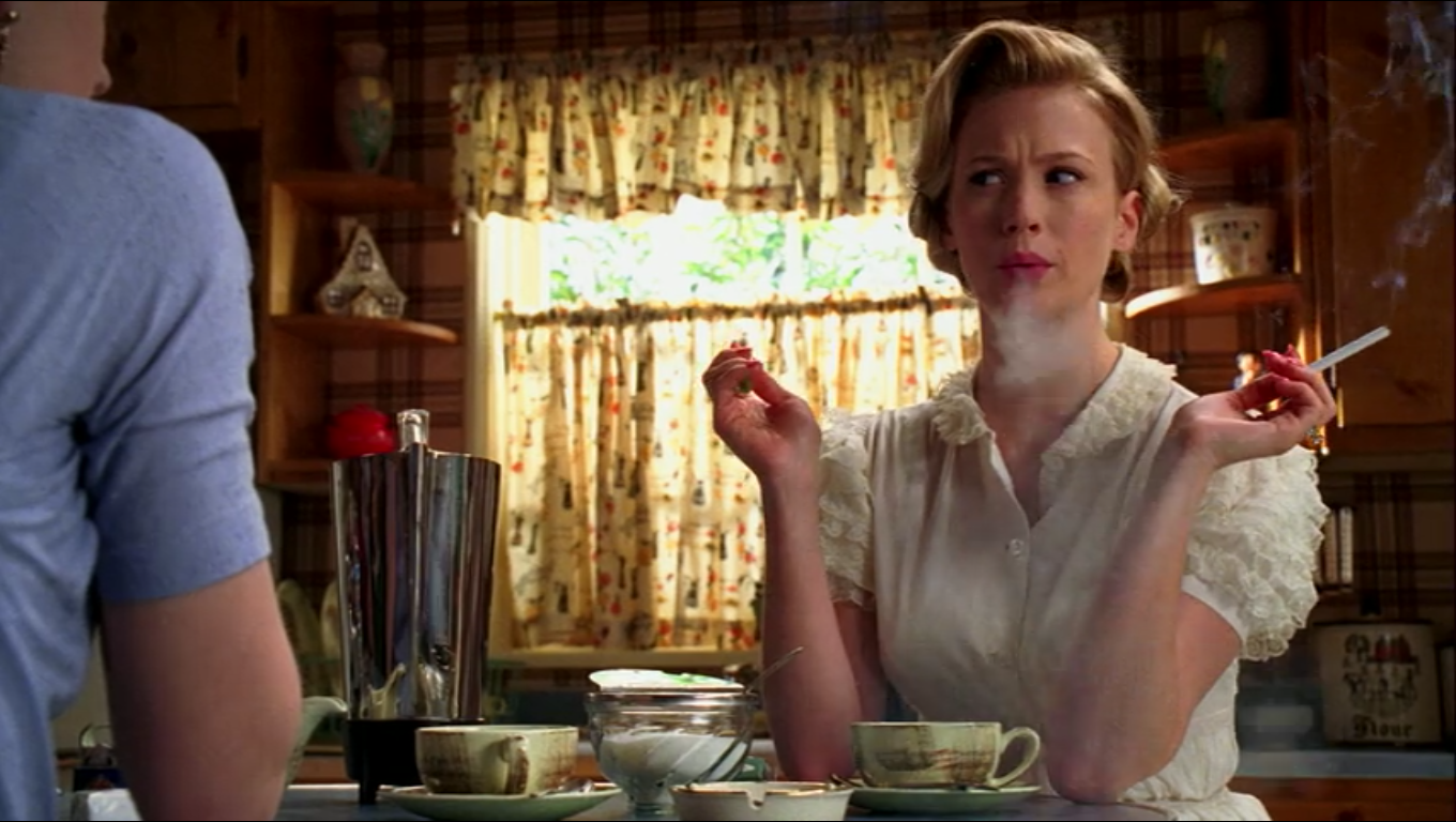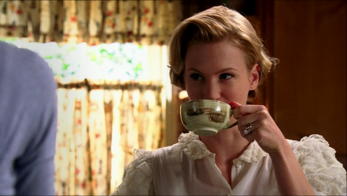 Set in the early 1960’s, Mad Men portrays an era where men worked and played harder than their wives, who were left alone to tend to their wifely duties. However, this is not necessarily the case for Mad Men’s sweet heart, Betty Draper. As the wife of the mysterious Don Draper, Betty has to undergo her husband’s light night hours, cheating scandals, and hard drinking yet unlike most women, she grows tired of the antics and speaks up against her husband. This can be understood in the first scene as we see Don come home late to dinner with his family. Throughout the somewhat tense and saddening scene, we see Betty sitting at the table with Metlox Poppytrails Vernon Kiln dinner plates. In the second scene, we see Betty drinking tea from a Metlox Poppytrails Vernon Kiln tea cup and saucer with her next door neighbor.