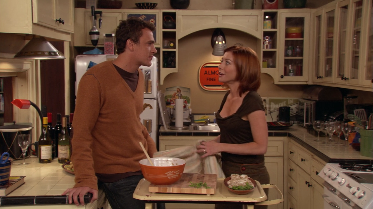As Lily explains to Marshall that, “It is time to grow up”, we see a Pyrex Autumn Harvest bowl seated on the metal stand. Created in 1979, the Autumn Harvest pattern features a bushel of wheat stalks designed against a retro orange-rust background, a perfect era piece for the already vintage, old-timey feel Marshall and Ted (played by Josh Radnor) have created for their apartment.