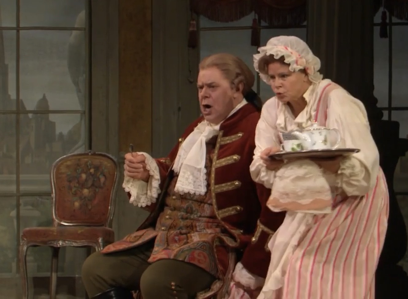 The Metropolitan Opera’s broadcast of Strauss’s Der Rosenkavalier features glorious music, sumptuous sets and costumes, and plenty of mistaken identity and hijinks to keep everyone guessing until the spectacular finale. The glamorous Marschallin has taken a younger lover – Octavian, the Count Refrano. They’re surprised by her cousin, the Baron Ochs, and she convinces Octavian to disguise himself as a serving maid to bring them tea. As part of a long line of operatic convention, young men are often played by women. So, Octavian is played by a woman pretending to be a man who disguises himself as a woman – and that’s just the beginning of the confusion. He/she brings them tea in this charming Godinger Primavera teapots as the Baron flirts shamelessly with this new “maid.” Needless to say, things get very complicated very quickly, but everything works out in the end and everyone ends up exactly where they should be.