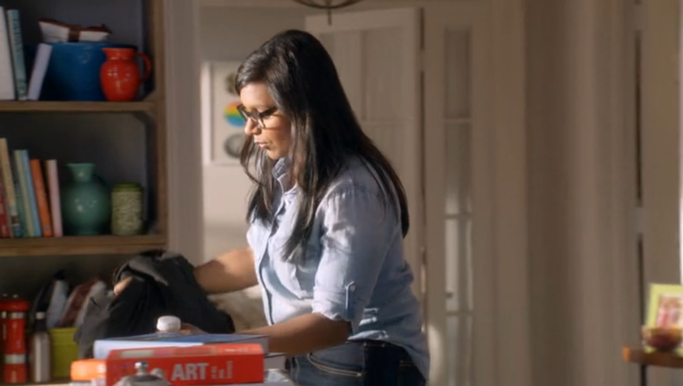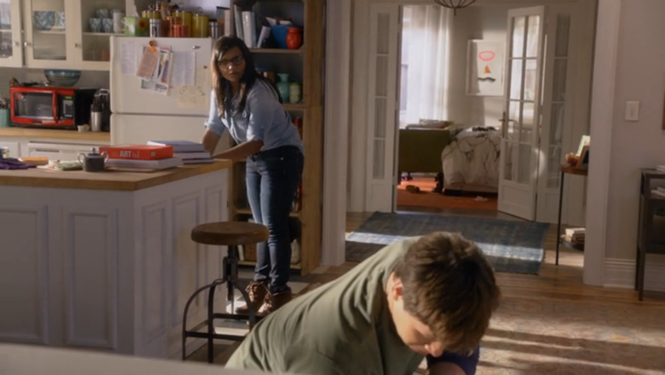 Mindy invites BFF Gwen to come and stay with her in the city while her husband is away, forgetting that, of course, Gwen’s daughter Riley would have to come too. To appease Riley (and Gwen), Mindy agrees to purchase bunk beds for her apartment. Mindy, however, has no assembly skills, and calls in Morgan to help. After returning to pick Morgan up some Cran-Raspberry juice, Mindy walks past the bookshelf in her kitchen. Tucked into the shelf among the books is a Homer Laughlin Fiesta Turquoise Open Carafe.