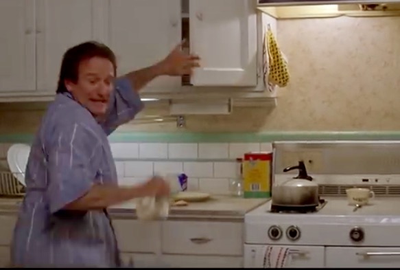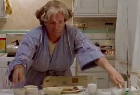 In this scene, the social worker has paid an unannounced visit to Daniel’s apartment to assess whether it is an appropriate environment for his children. Caught in his Mrs. Doubtfire garb, he claims to be Daniel’s sister paying a visit from England. Unfortunately, his mask is destroyed leaving him with no other option but to cover his face with meringue from a dessert found in the refrigerator. He continues to serve tea to the social worker while meringue drips from his face into the teacups.