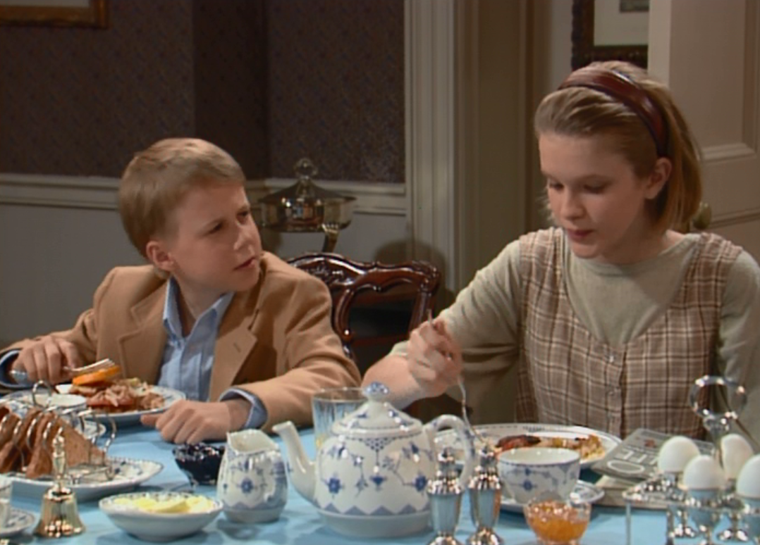 In the first episode, the family uses a gorgeous Denmark Blue set by Furnivals. This set is similar to Blue Fluted by Royal Copenhagen, however, the Furnivals pieces are slightly more sturdy than Royal Copenhagen, as can be seen with the teapot and sugar bowl.