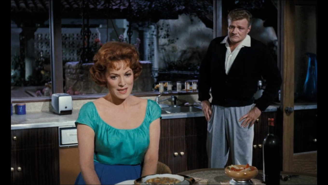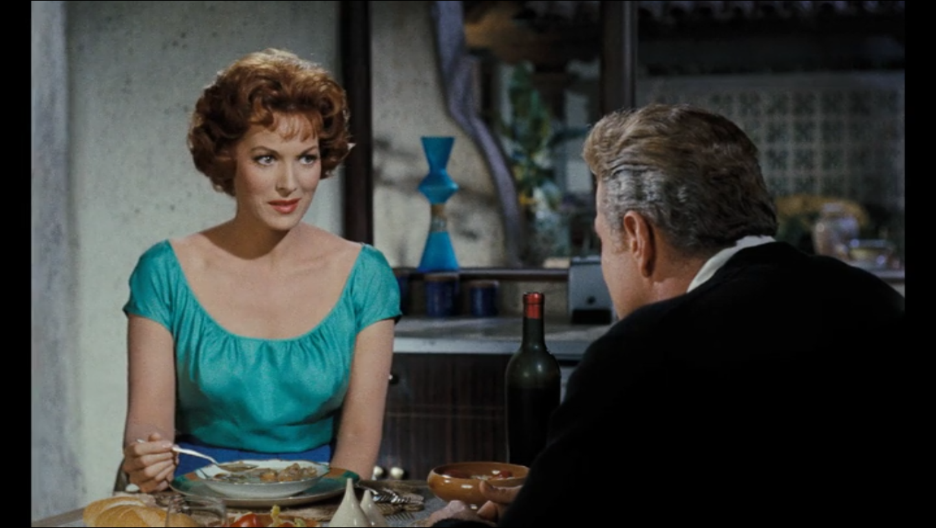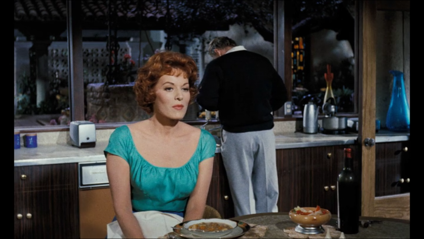 At the end of this romantic caper, Mitch realizes that it isn’t having a woman in his life that he misses, it’s Maggie he misses. As he washes the stew off his shirt, he tries to woo Maggie back into his life with a comical list of things he misses about her: The wet stockings she would hang around the bathroom, his razor being dull because she used it to shave her legs too often, her hair pins mixed up with the fish hooks in his tackle box, having a clothes closet all to himself, and swearing is no fun, because Maggie isn’t there to pretend to be shocked. He clinches his list with, “Nothing is any good without you Maggie.”