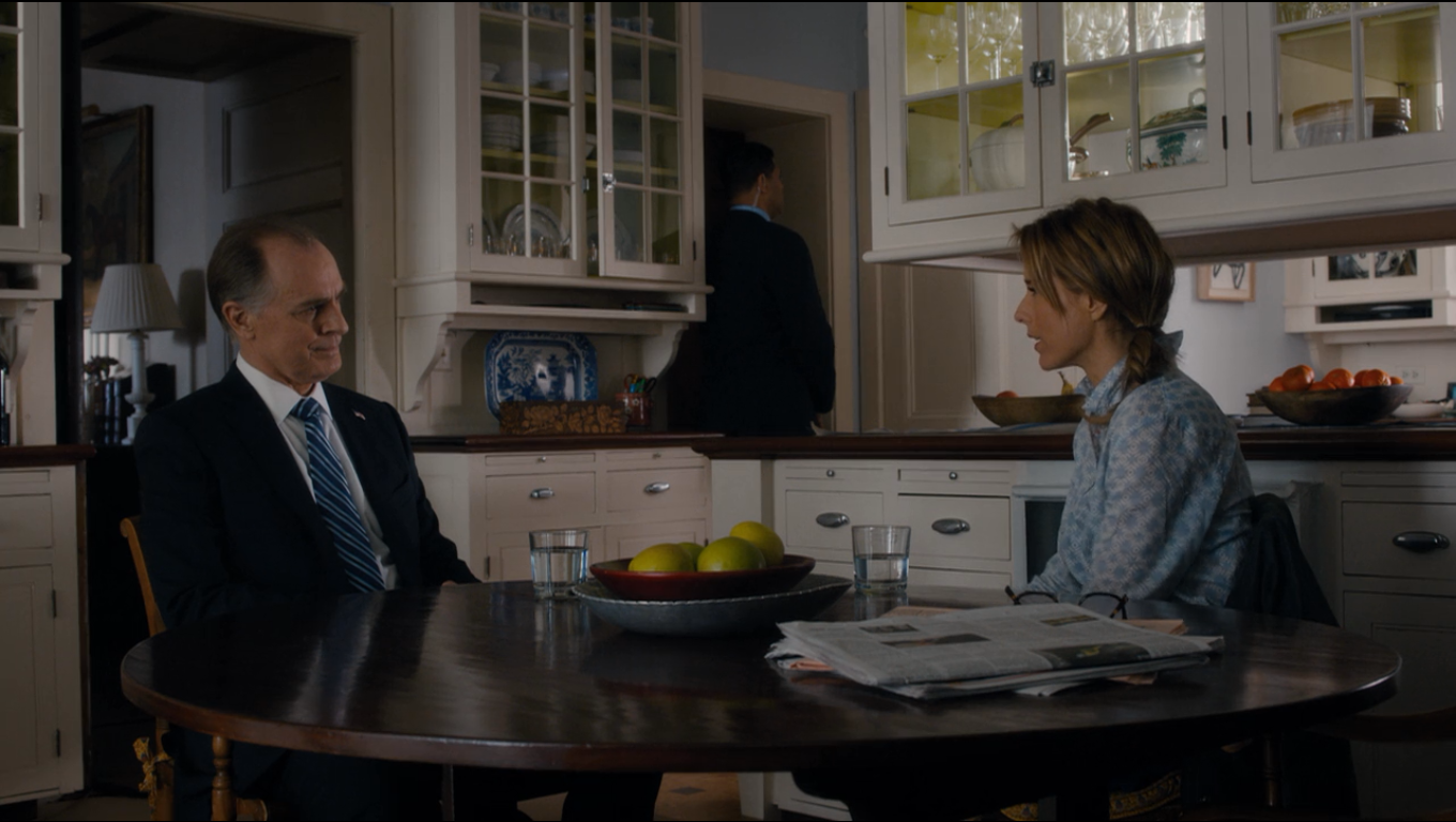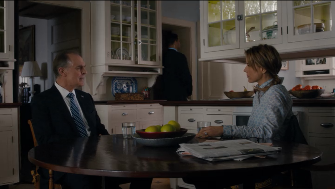 As Elizabeth is pitching hay, her son Jason brings her phone to her, saying that it won’t stop ringing. As she heads out of the barn, she sees the Presidential motorcade pulling up in front of her house. Elizabeth sits down with President Conrad Dalton in her dining room, and is asked to step in as Secretary of State. Elizabeth’s initial reaction is to laugh, and then ask why? As she sits across from President Dalton, we can see a gorgeous Blue Willow by Burgess & Leigh Platter. This platter is distinct among Blue Willow designs with its softly octagonal shape, and pagoda in the top right of the design instead of the more common tree.