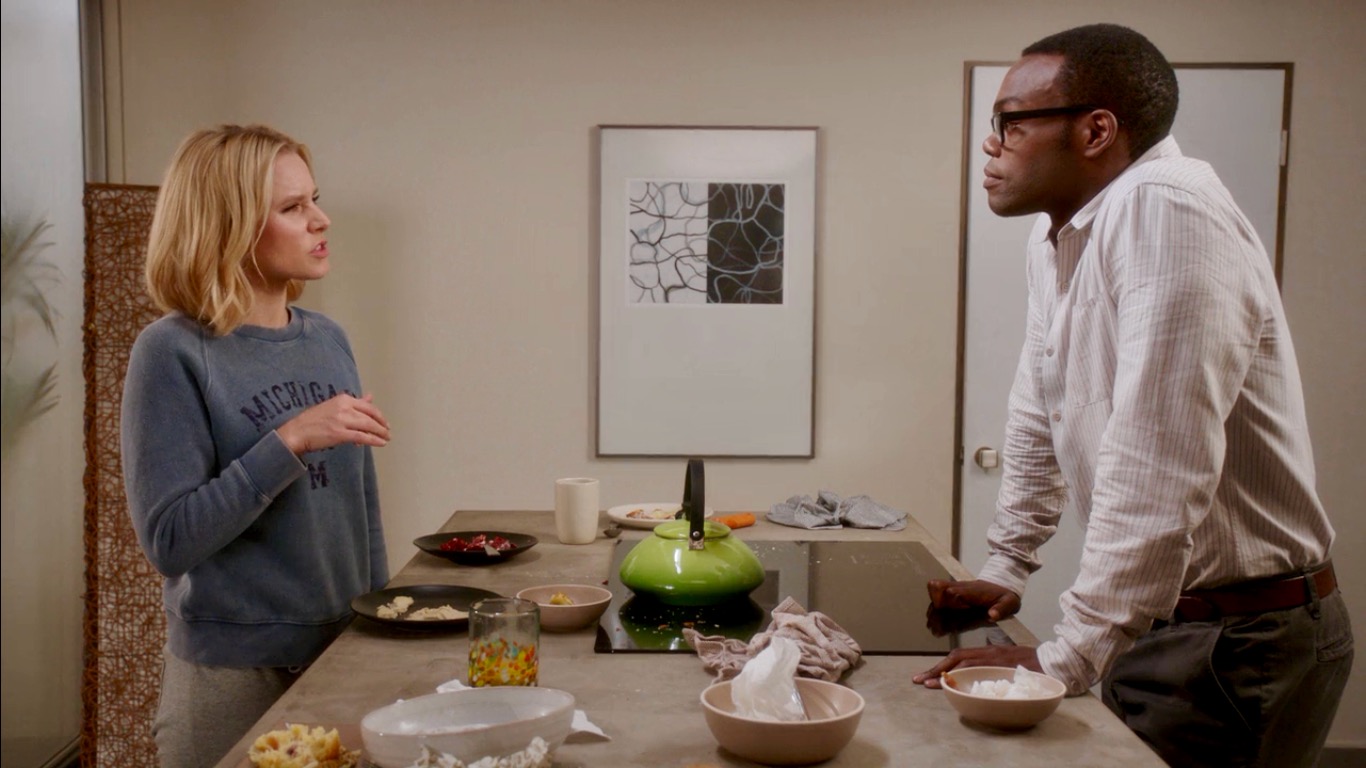 In this episode, Chidi, an ethics professor in life and Eleanor’s assigned soul-mate in the after-life, discovers Eleanor’s secret and gives her lessons in morality in the hopes of keeping her from going to the Bad Place. Frustrated, he realizes that Eleanor has become a full-time job, and he grows weary of trying to reform her. They argue and decide they need space from each other at the same time Michael issues a lock down. Apparently, a sink-hole has unexplainably appeared in the neighborhood, and Michael asks all residents to stay inside for their safety. Tensions mount as Chidi and Eleanor are confined to their house for days.