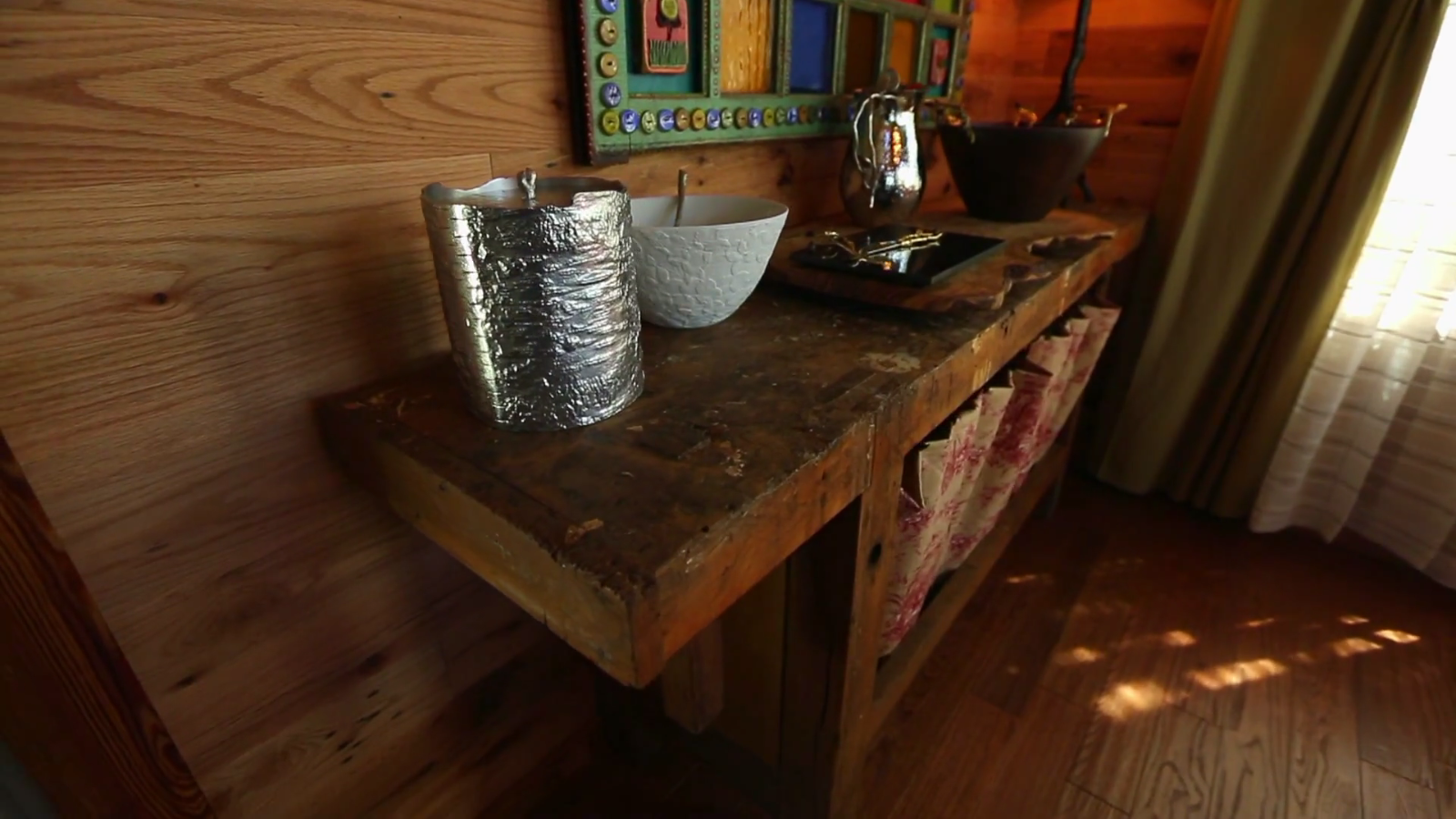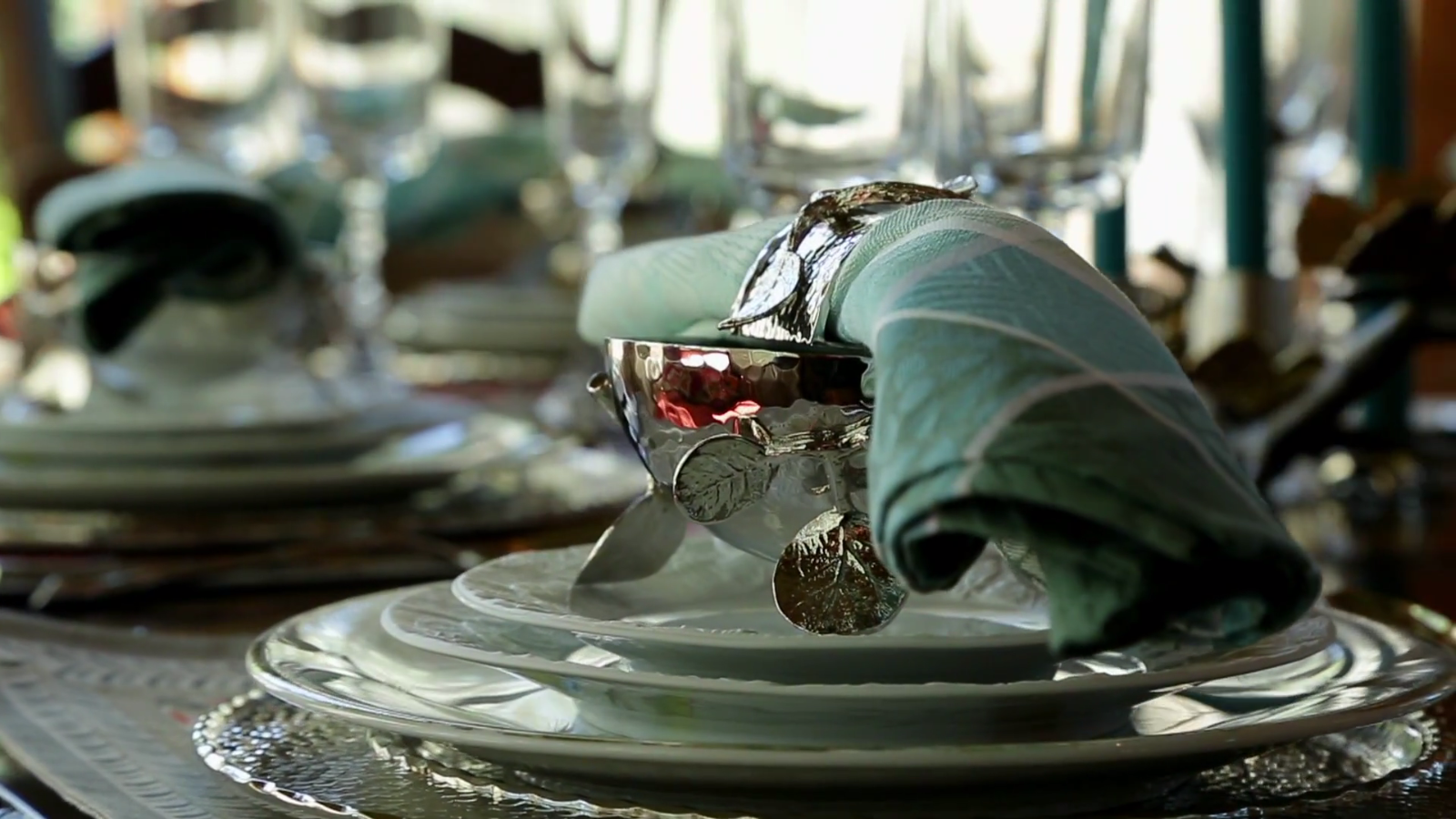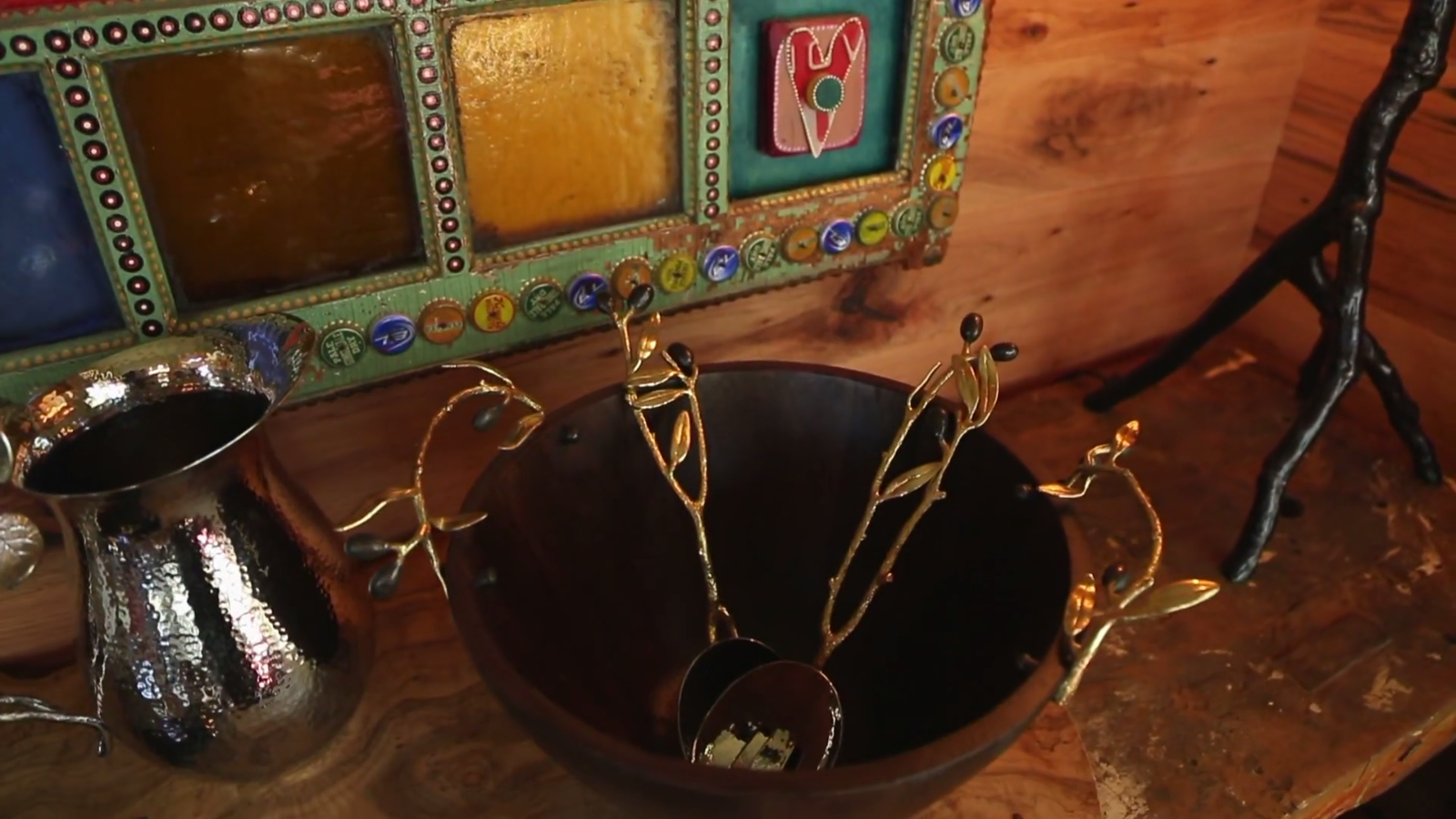 Designer Tory Jones used several Michael Aram Olive Branch serving pieces to compliment the Provencal design. Olive branch pieces include a large wooden wide serving bowl, pitcher, cheese board, and serving utensils. Additionally, she used Michael Aram Forest Leaf china – the perfect choice for any treehouse dining room! Other Aram pieces used include Botanical Leaf napkin rings and Bark polished ice bucket.