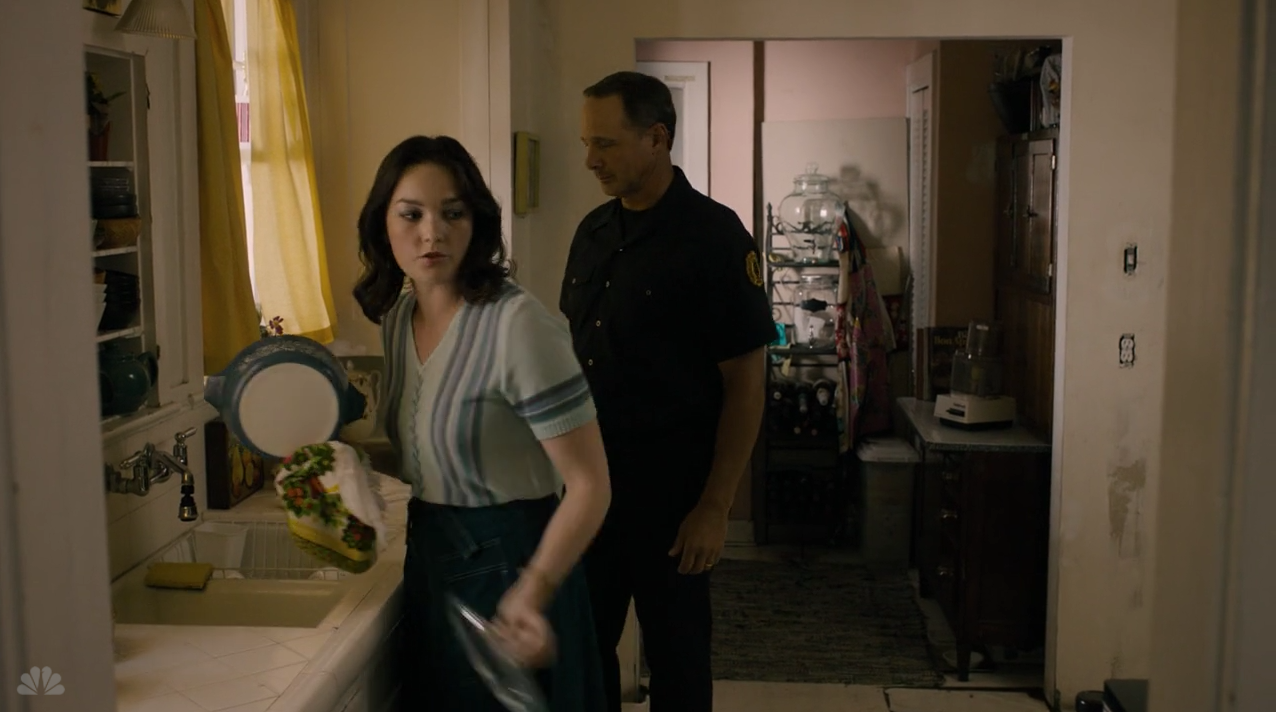As the scene continues we notice the fireman’s wife is cleaning a Corning Colonial Mist covered casserole. This pattern was initially produced in 1983 to complement the Corelle Colonial Mist collection. This pattern features a floral blue on white or white on blue depending on the piece. There is also a Dansk Kobenstyle Yellow metal covered casserole sitting on the stove. The Kobenstyle Yellow pattern was also manufactured in the 1980’s and features enameled steel rather than the traditional heavy metal.