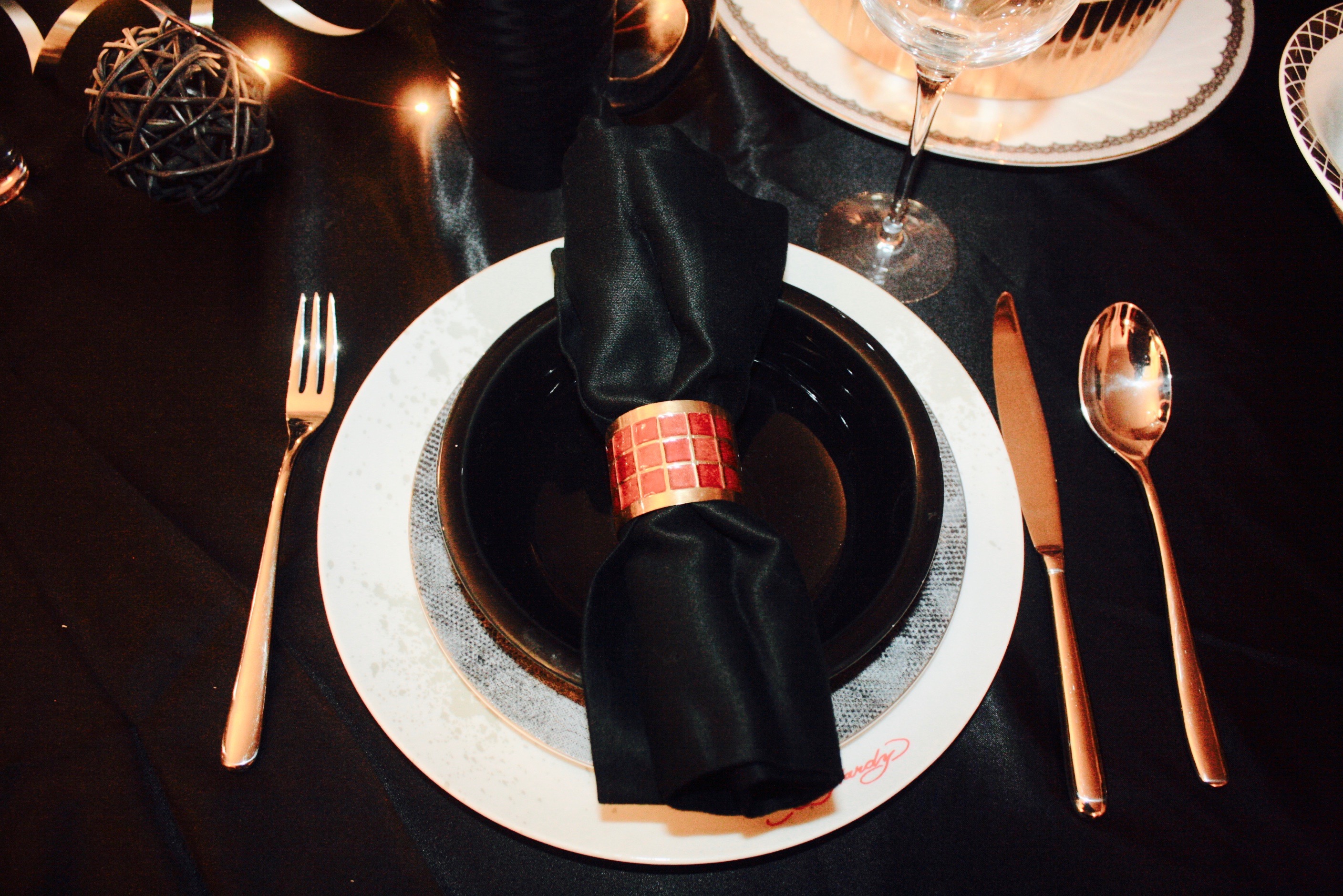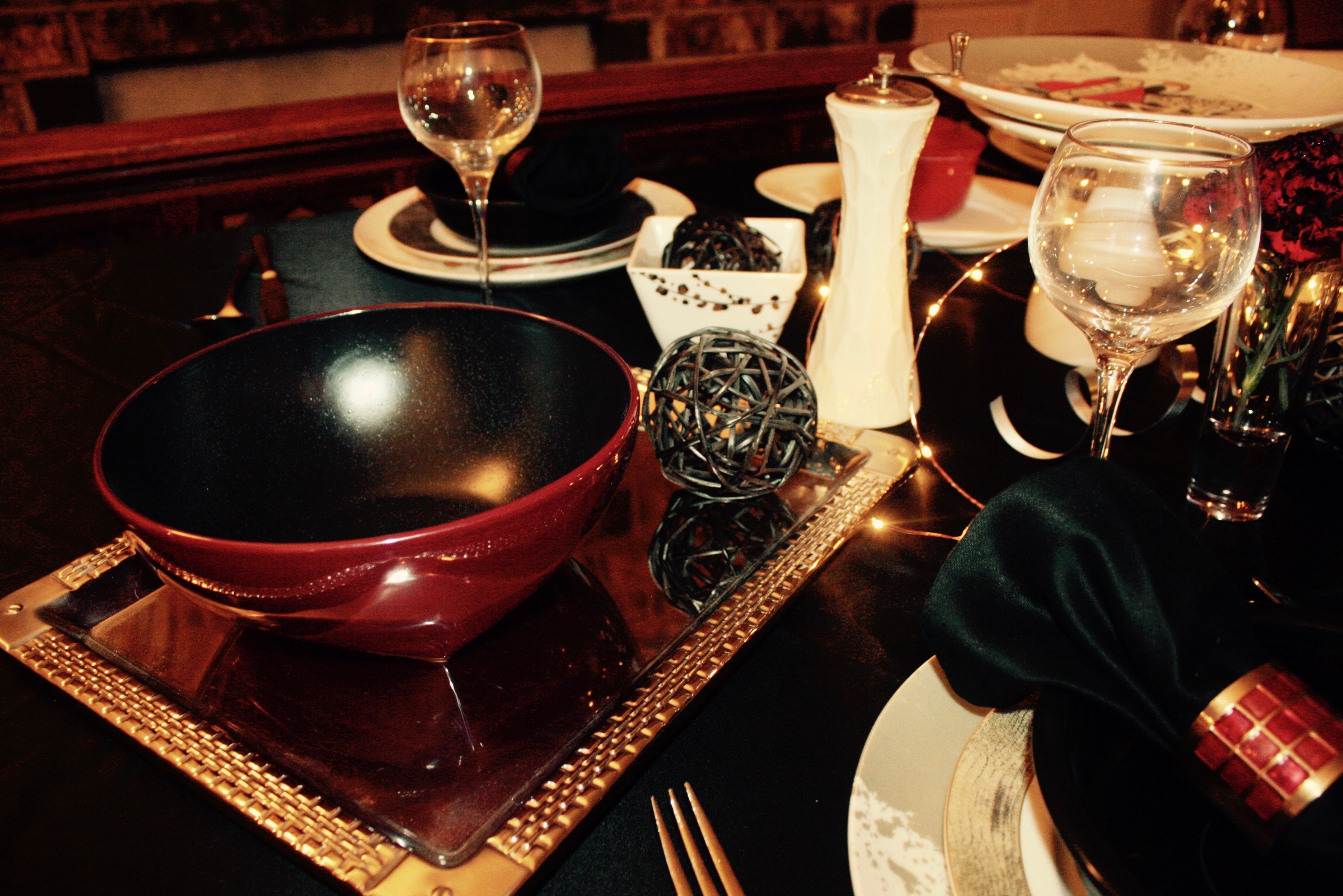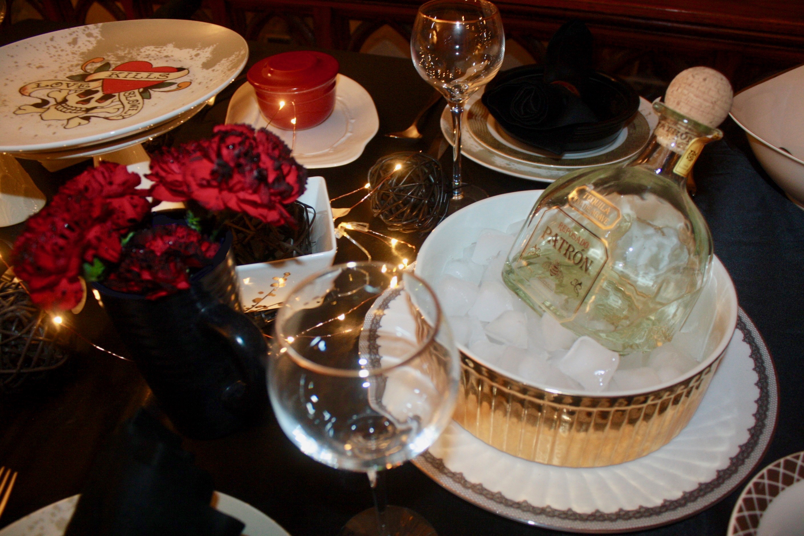 Vases- for this meal, a dainty vase wasn’t going to cut it. So we used a black mug and shot glass as anti-romance options.