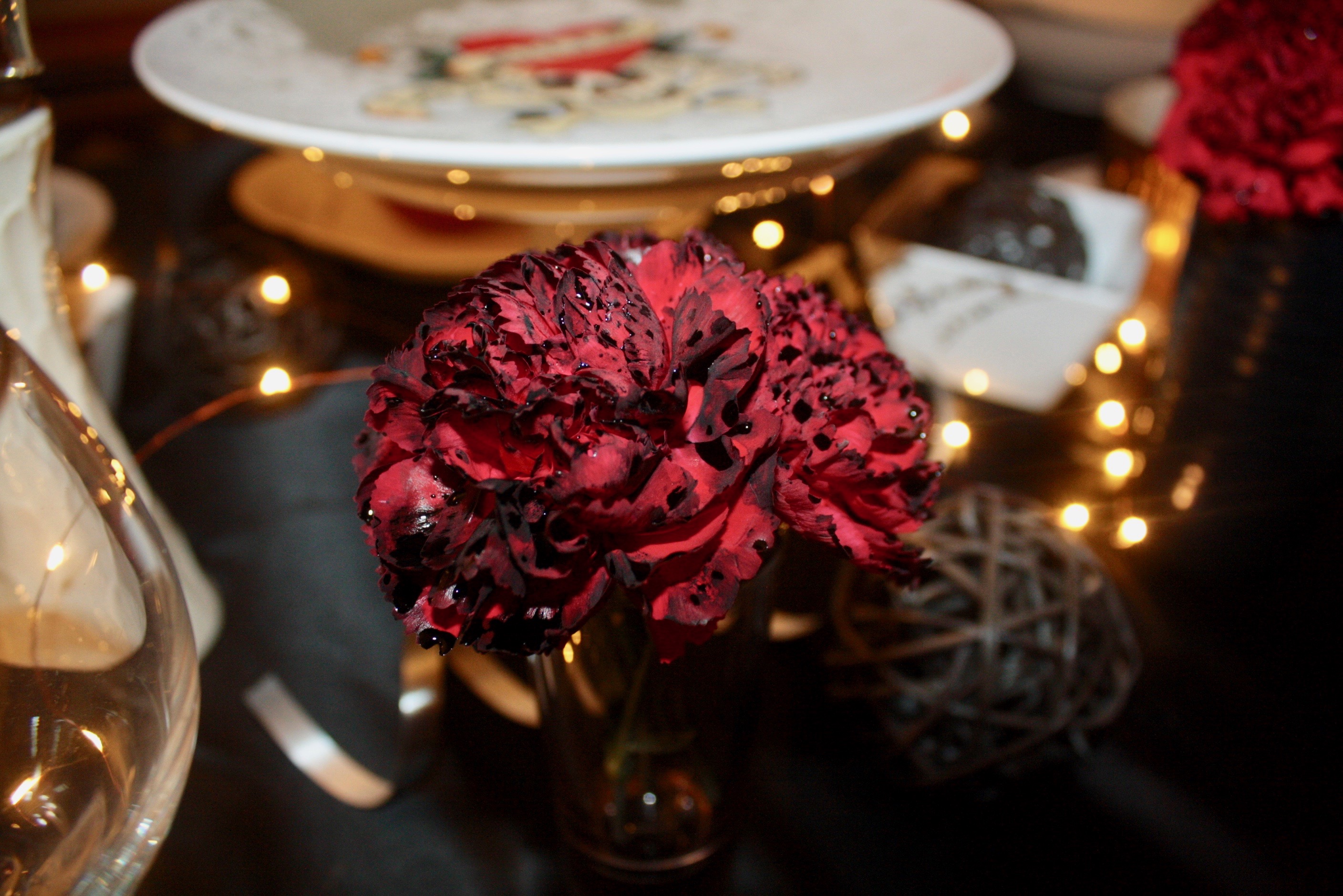 To give the flowers a Down with Love vibe, I dipped them in black food coloring. After dipping the flowers, wait for the food coloring to dry before placing on your table.
