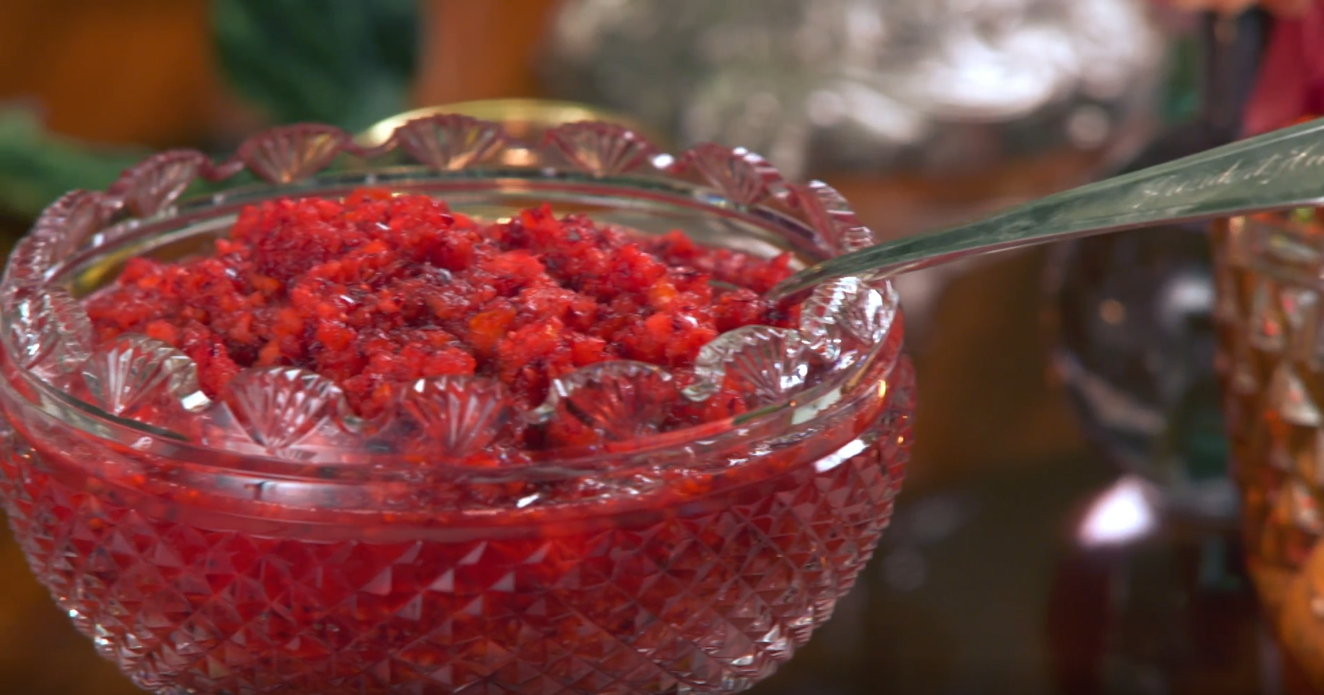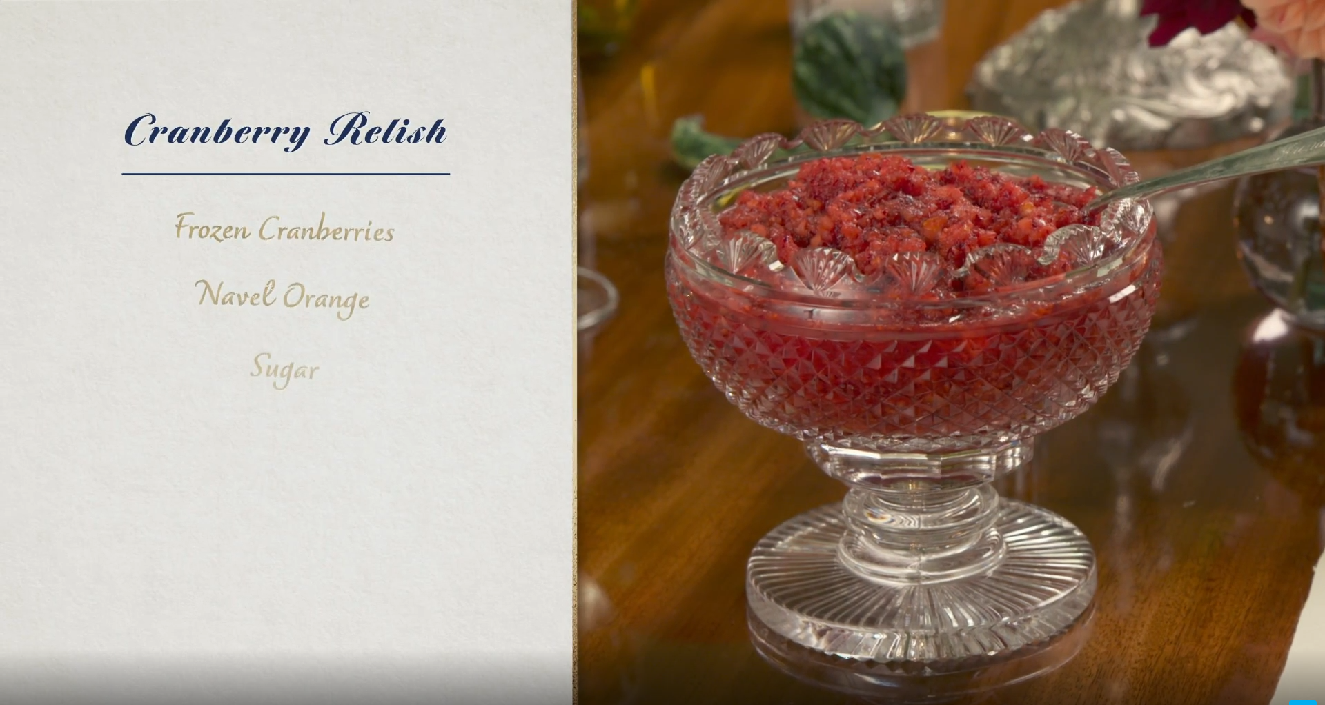 Trisha Yearwood indicates that relish is much easier to make than cranberry sauce because it isn’t cooked – the ingredients are just blended together raw, then served. Preparation for this traditional Thanksgiving side dish takes only 5 minutes. The cranberry relish is presented in a gorgeous Waterford cut crystal 5″ footed bowl. This may be a subtle nod to President Joe Biden’s Irish roots, or it may be a testament to the beauty and elegance of Waterford crystal.