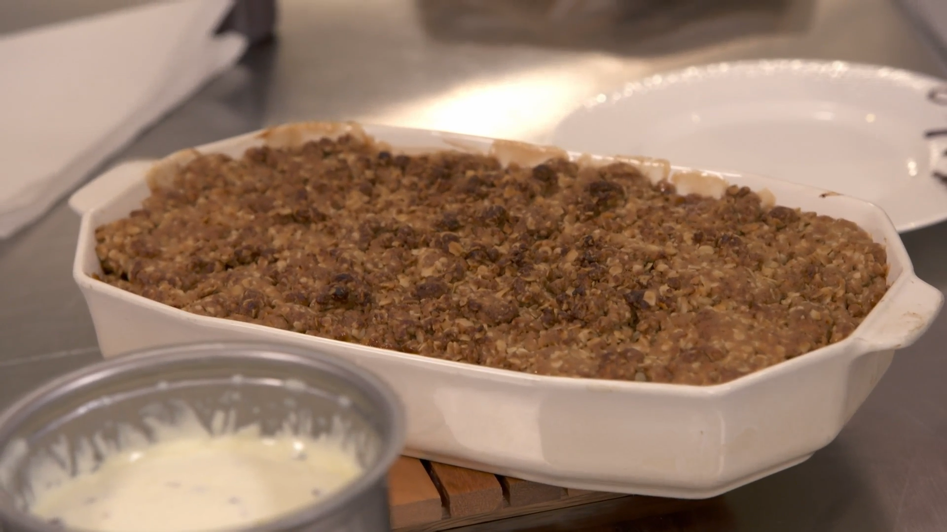 The crisp is baked in a very traditional baking dish – Pfaltzgraff Heritage White. The Pfaltzgraff family immigrated to the United States in the early 1800s and established their pottery in York, Pennsylvania. This may be another nod to President Biden’s family heritage – this time, his link to his childhood in Pennsylvania.