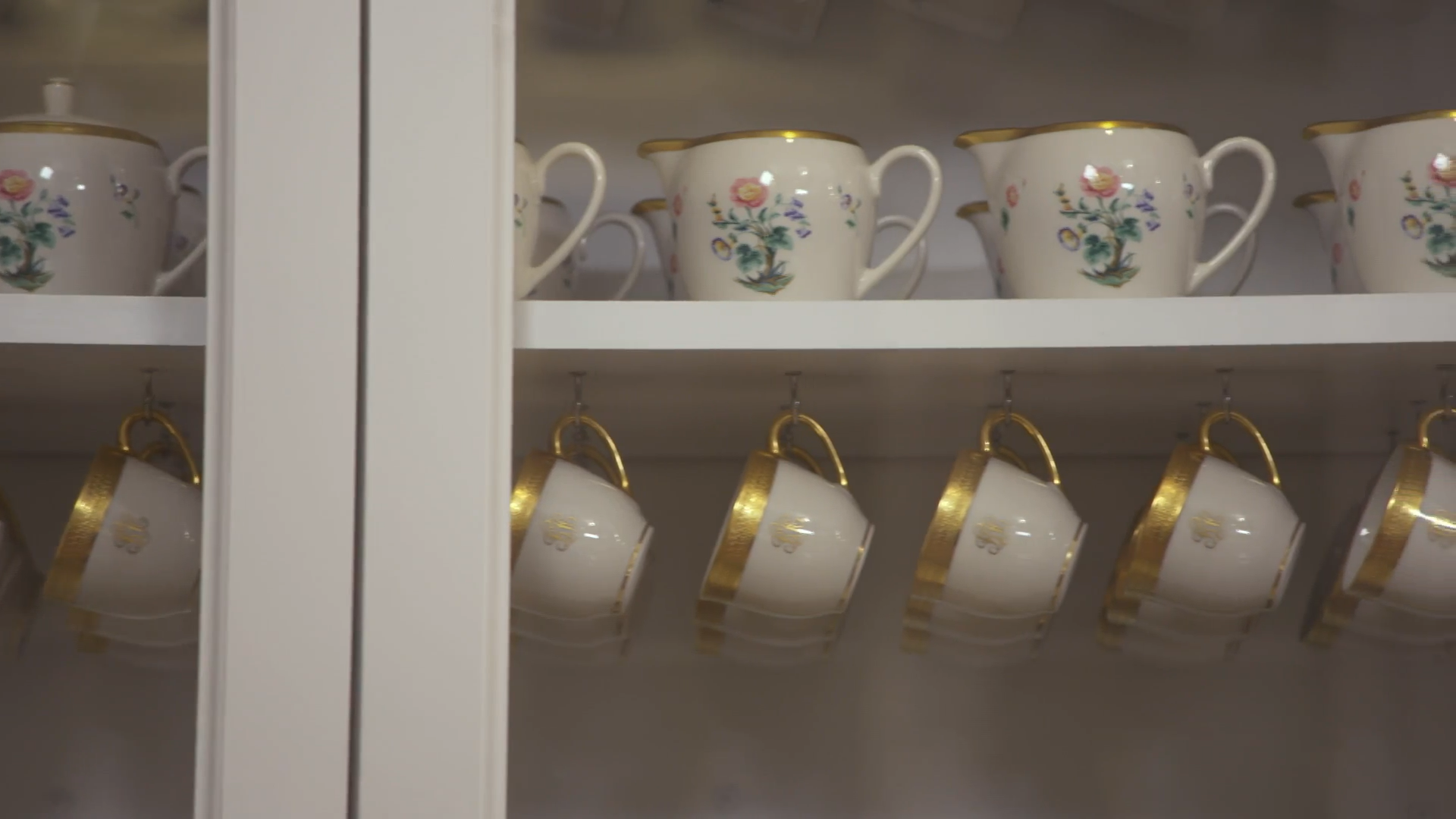 The pattern features a creamy white background with a vibrant floral design and rich gold trim. The sugar bowl and creamers can be seen in the butler’s pantry as Dr. Biden and Trisha Yearwood enter the kitchen at Blair House.